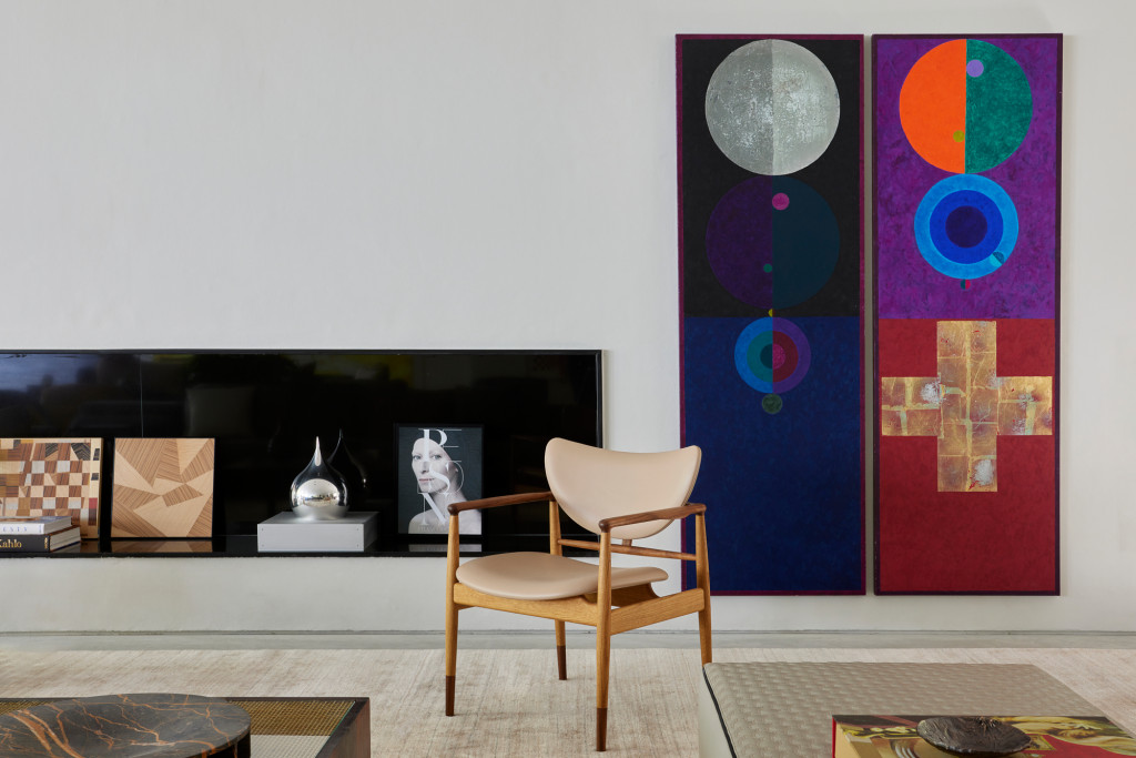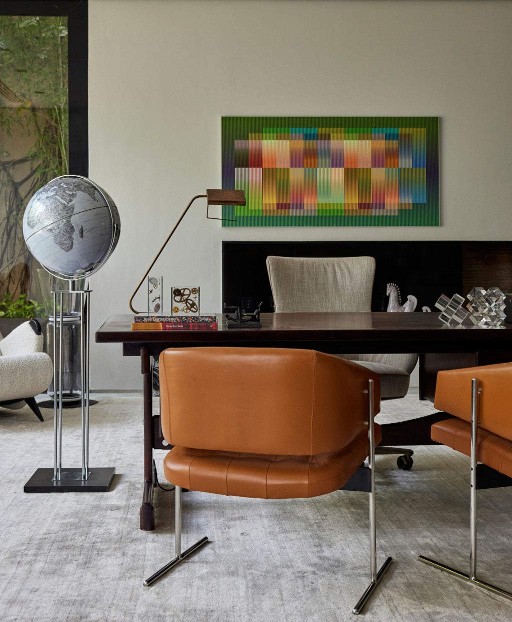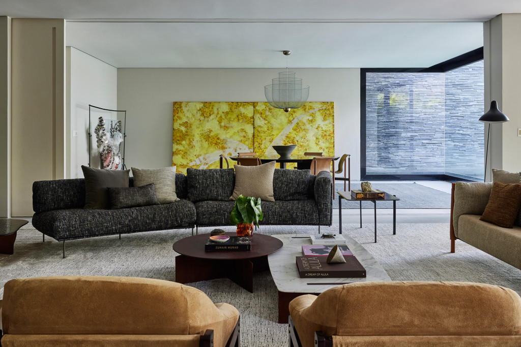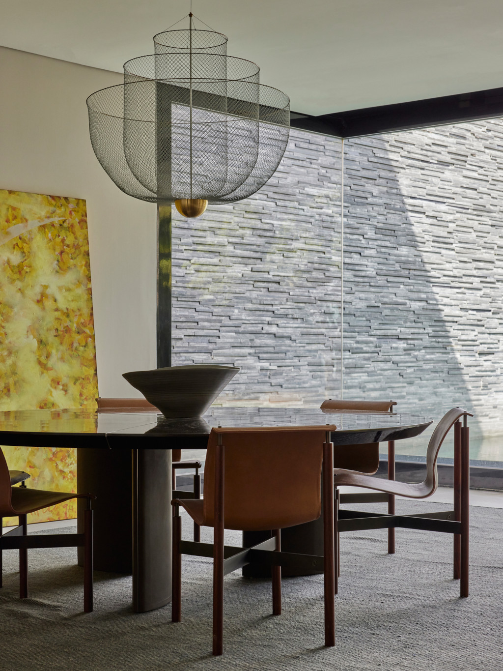 The delicate equation between sophistication and irreverence permeates the interior design for this residence in São Paulo. With integrated rooms, variations in ceiling height and a large sliding glass door that connects the rooms to the external area, the P555 takes advantage of the breadth of the internal spaces to create a true gallery for works of art, as well as Brazilian and international furniture. Large monochromatic planes, shades of gray and the noble dark woods of the furniture consolidate a sober and elegant base on which some vibrant colors of contemporary and modern pieces emerge.