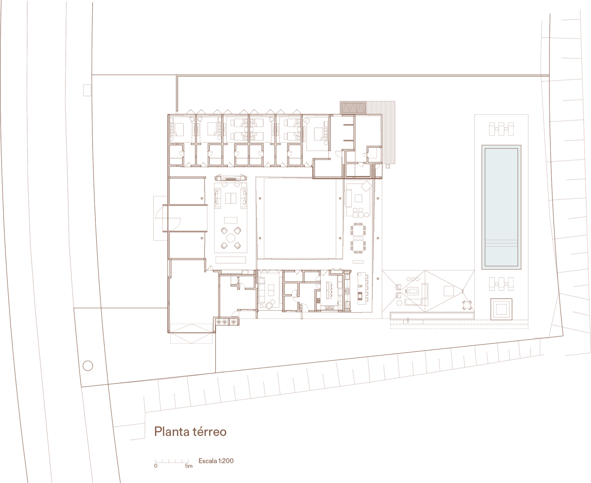 The monastic orthogonality of the residence designed by Consuelo Jorge serves as the foundation for the interior design project. Balancing the transparency of the architecture, which seamlessly incorporates the landscape designed by Gilberto Elkis, P242 presents a predominantly horizontal composition and a subdued color palette. This approach respects the sobriety of the built volume, while the subtle use of warmer tones and wooden cladding enhances the greenery of the inner courtyard and surrounding gardens. The dynamism of the composition is brought to life through the furniture, which blends geometric rigor with curved lines.