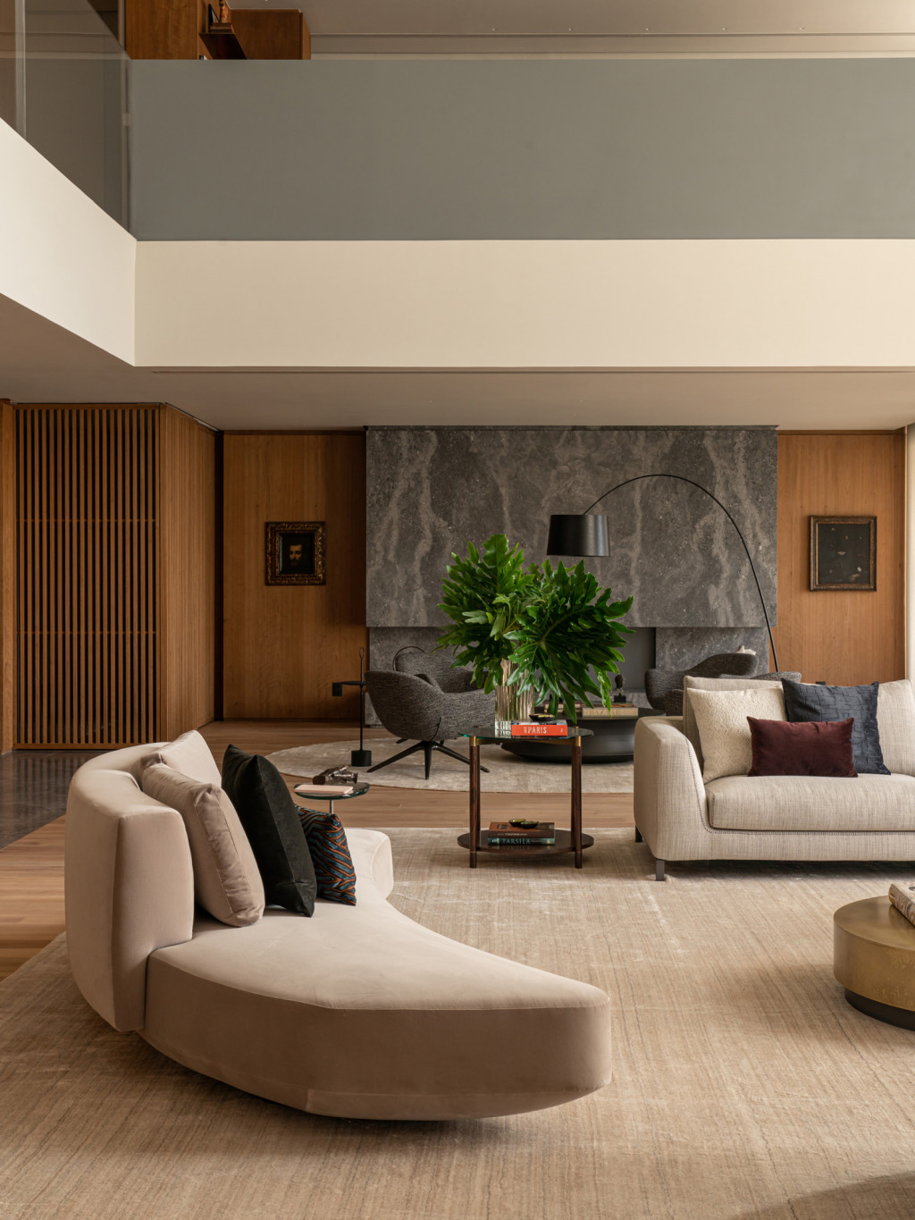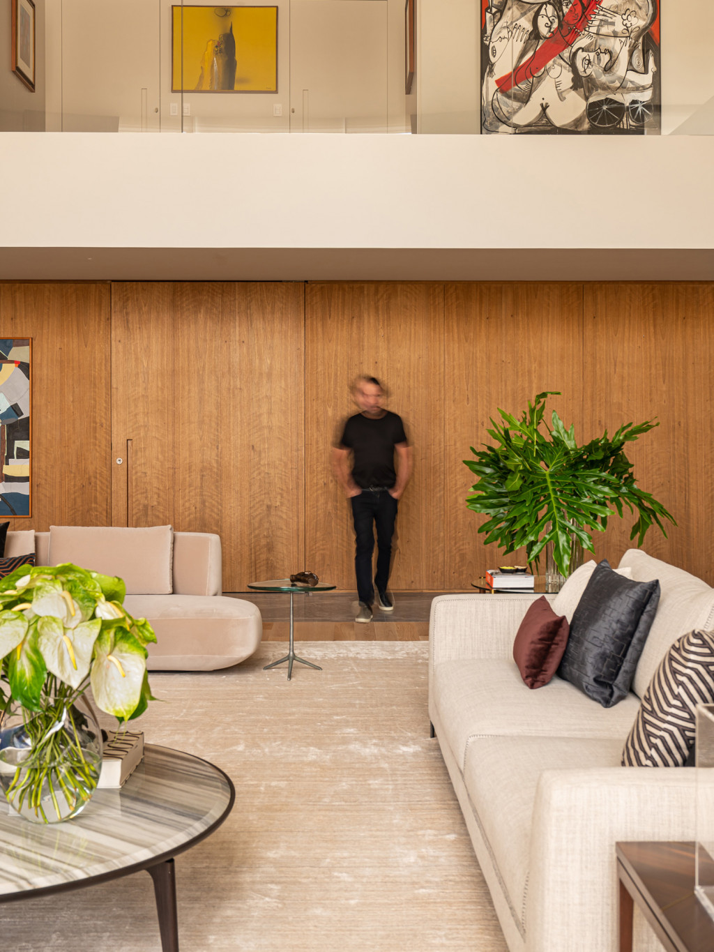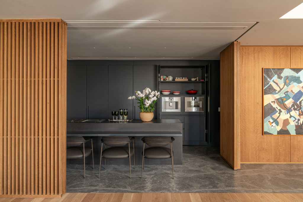 In addition to taking advantage of the double-height ceiling of the duplex apartment, the P419 leverages the layout of the first floor to create an expanded living area by integrating three adjoining rooms. Two other spaces are part of this large living area but are separated by sliding doors made of vertical wooden slats. When opened, they further expand the common-use area, forming a single environment that spans more than half of the floor; when closed, they create a cohesive wooden plane that separates the living area from the service core located in the rear of the layout.