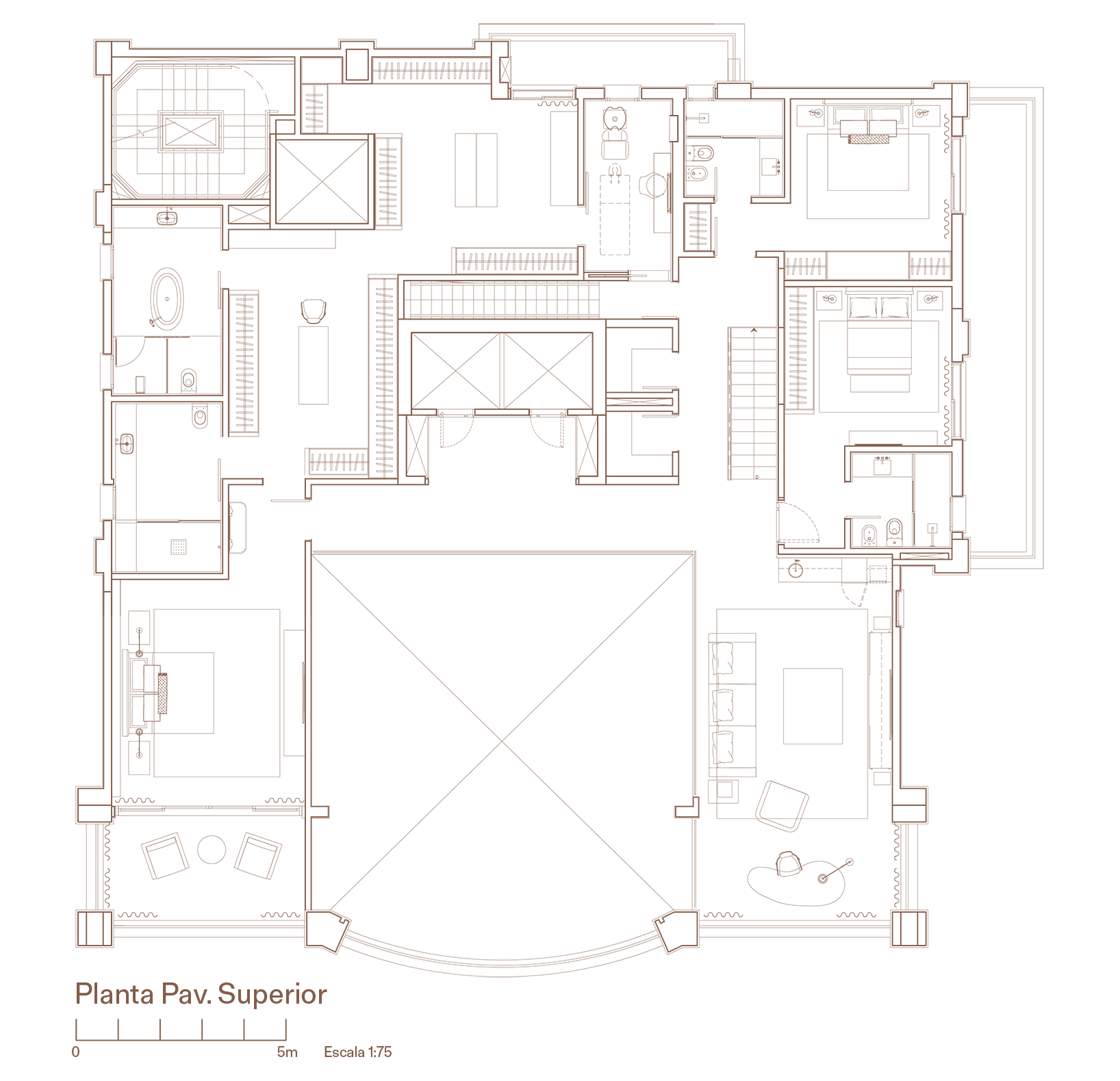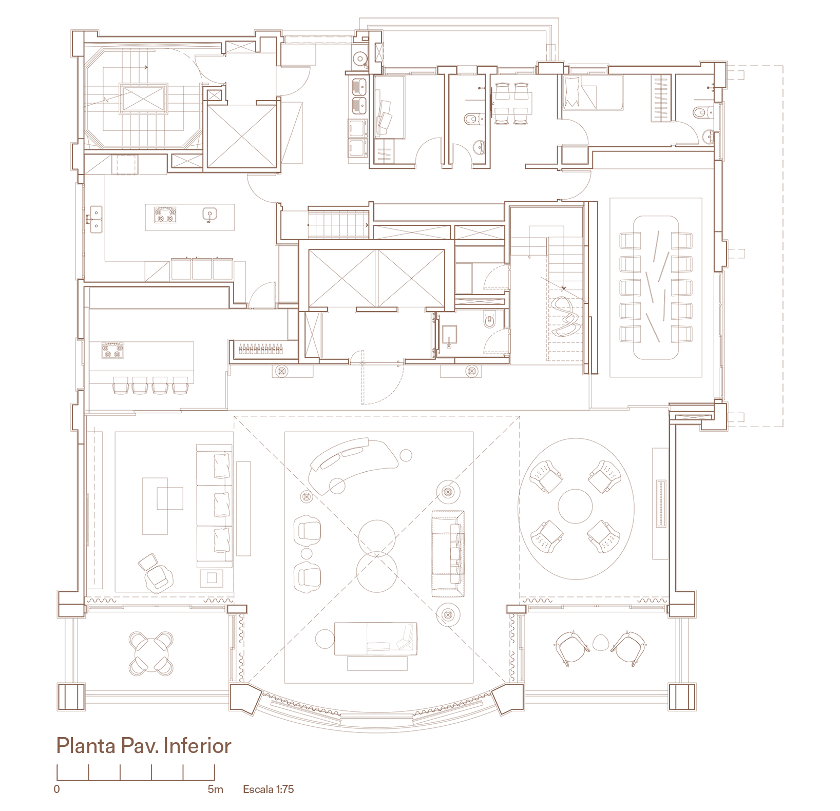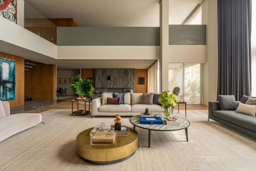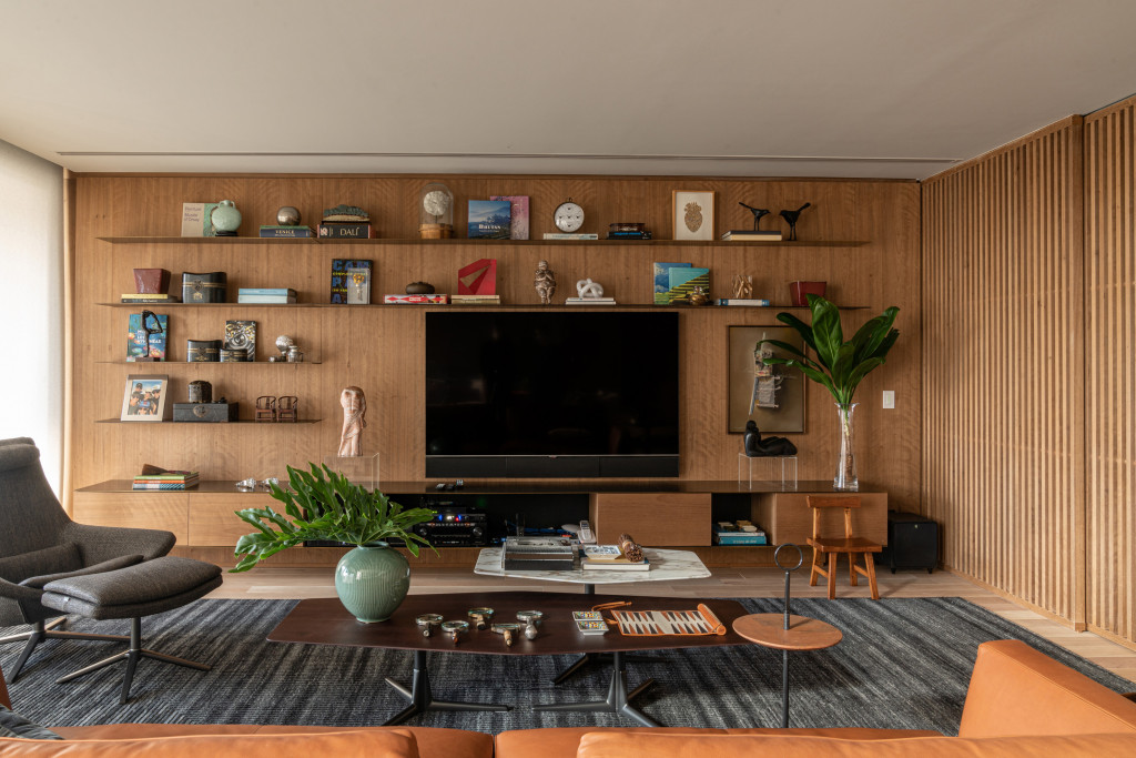 In addition to taking advantage of the double-height ceiling of the duplex apartment, the P419 leverages the layout of the first floor to create an expanded living area by integrating three adjoining rooms. Two other spaces are part of this large living area but are separated by sliding doors made of vertical wooden slats. When opened, they further expand the common-use area, forming a single environment that spans more than half of the floor; when closed, they create a cohesive wooden plane that separates the living area from the service core located in the rear of the layout.