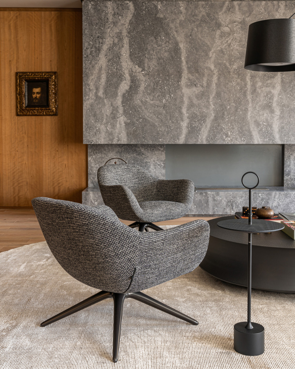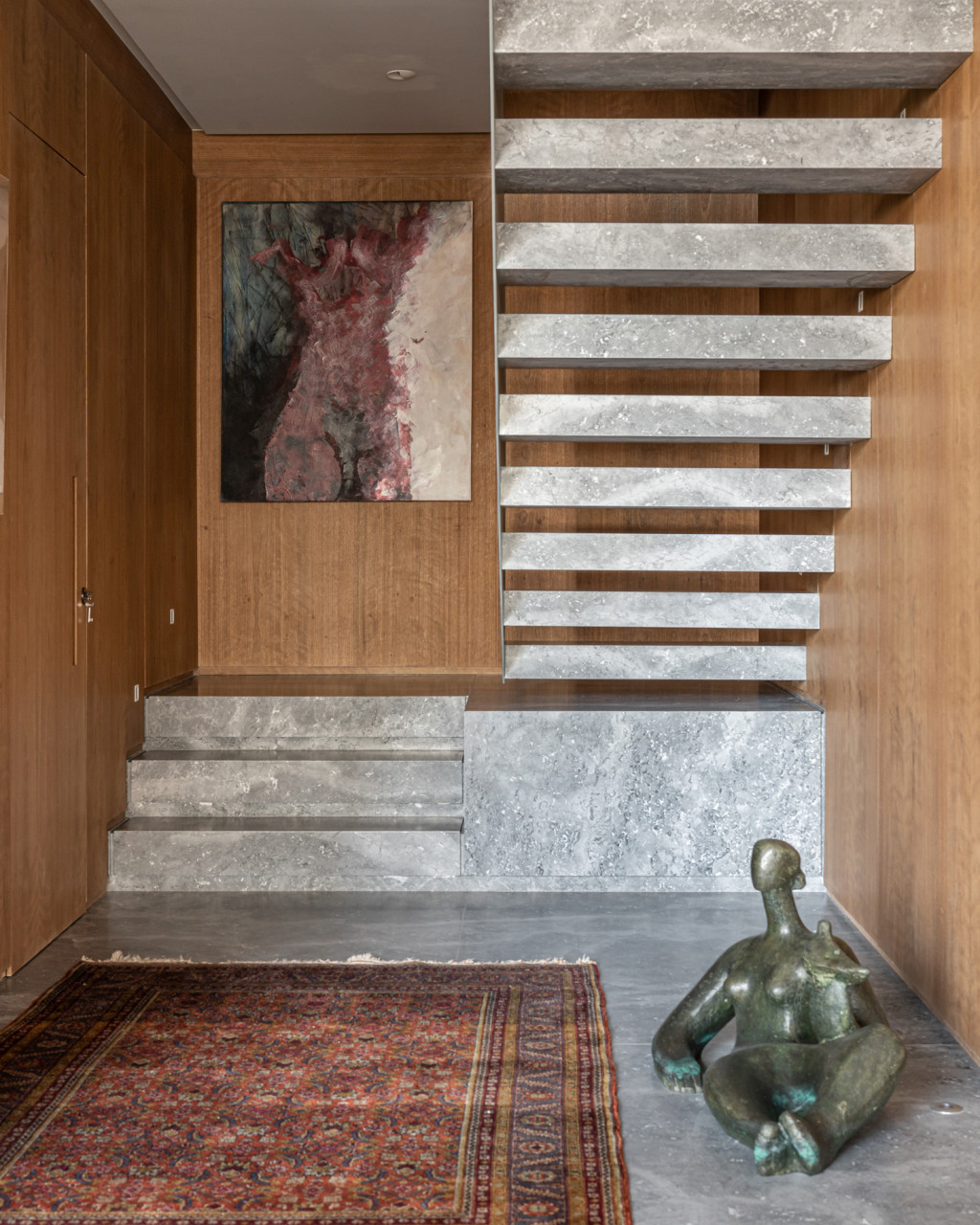 The staircase leading to the second floor is nestled into a recess within the wooden plane. Its steps are clad in gray marble, and its guardrail is made of a lead-colored metal sheet. This staircase serves as a key feature of the project, both for the chromatic contrast it establishes with the wood and for its sculptural design.