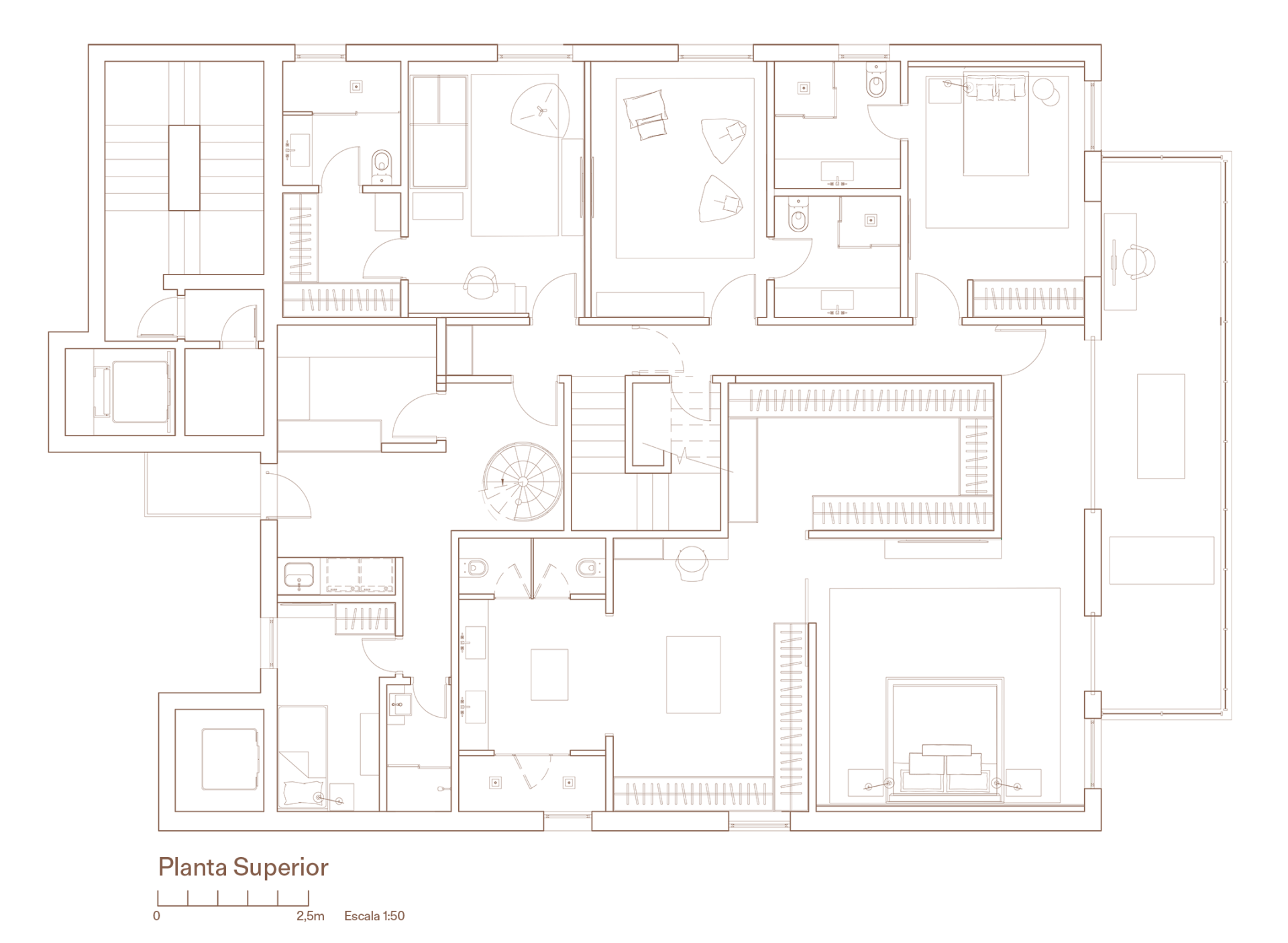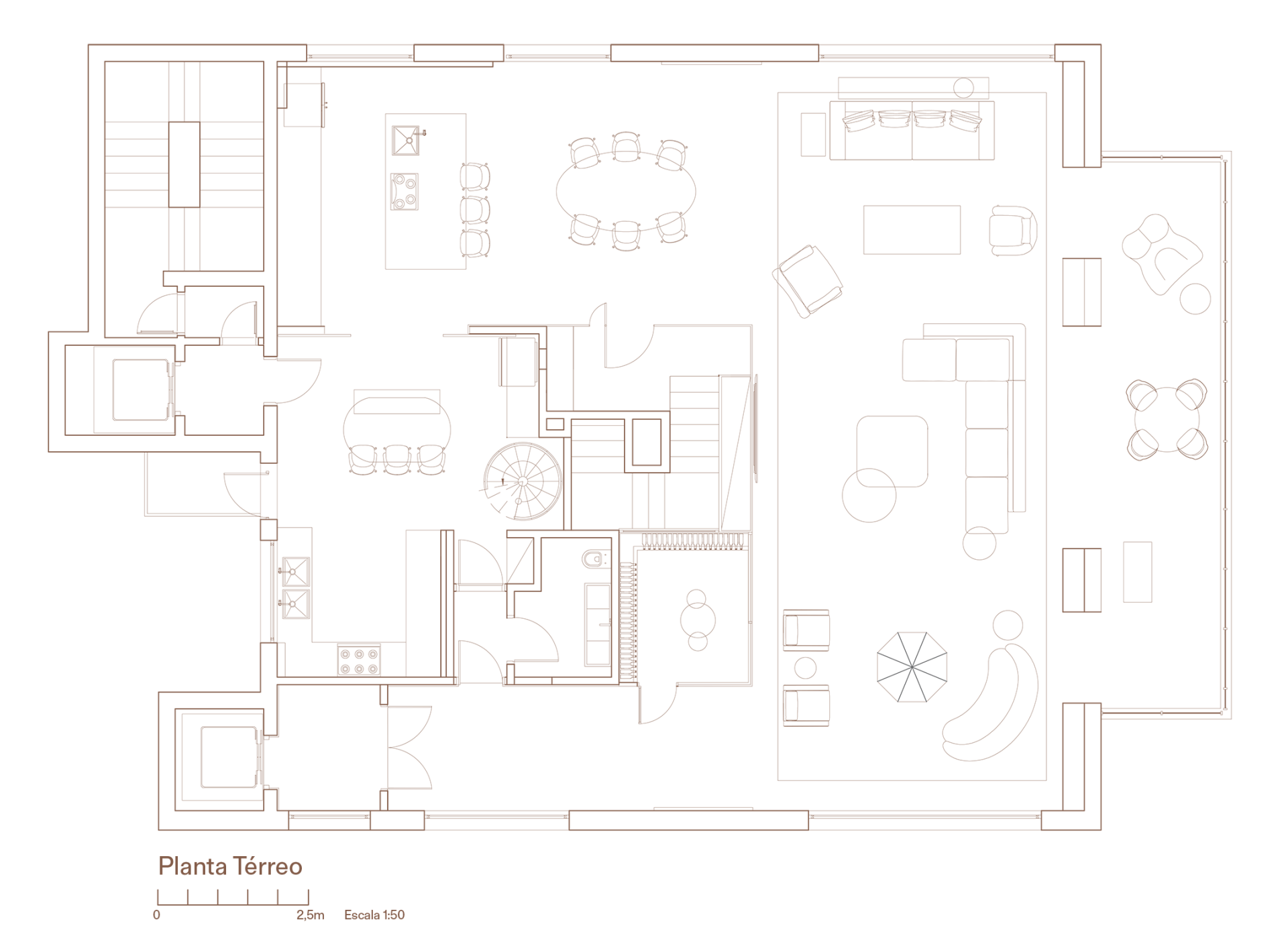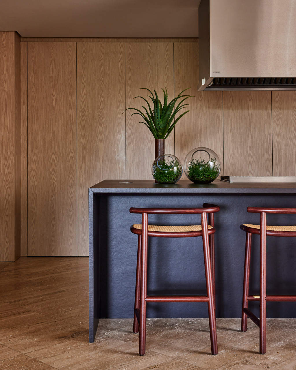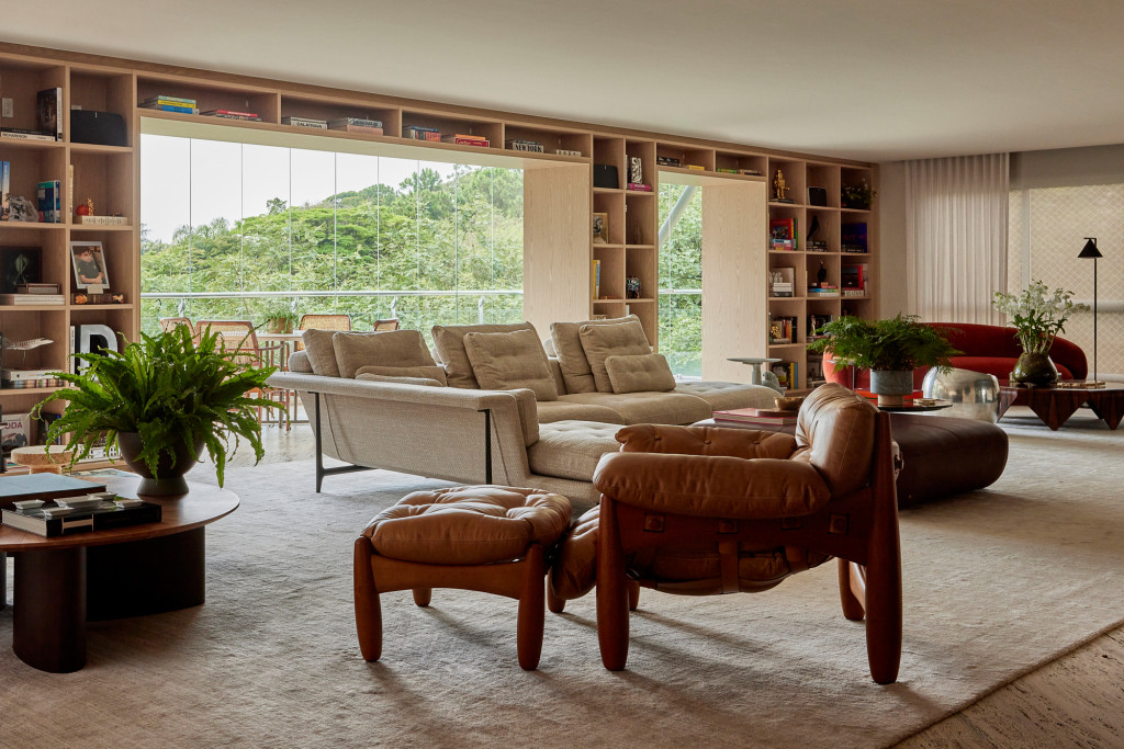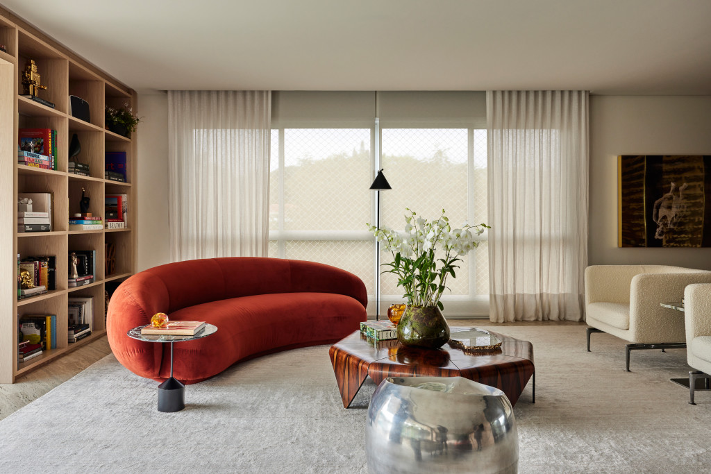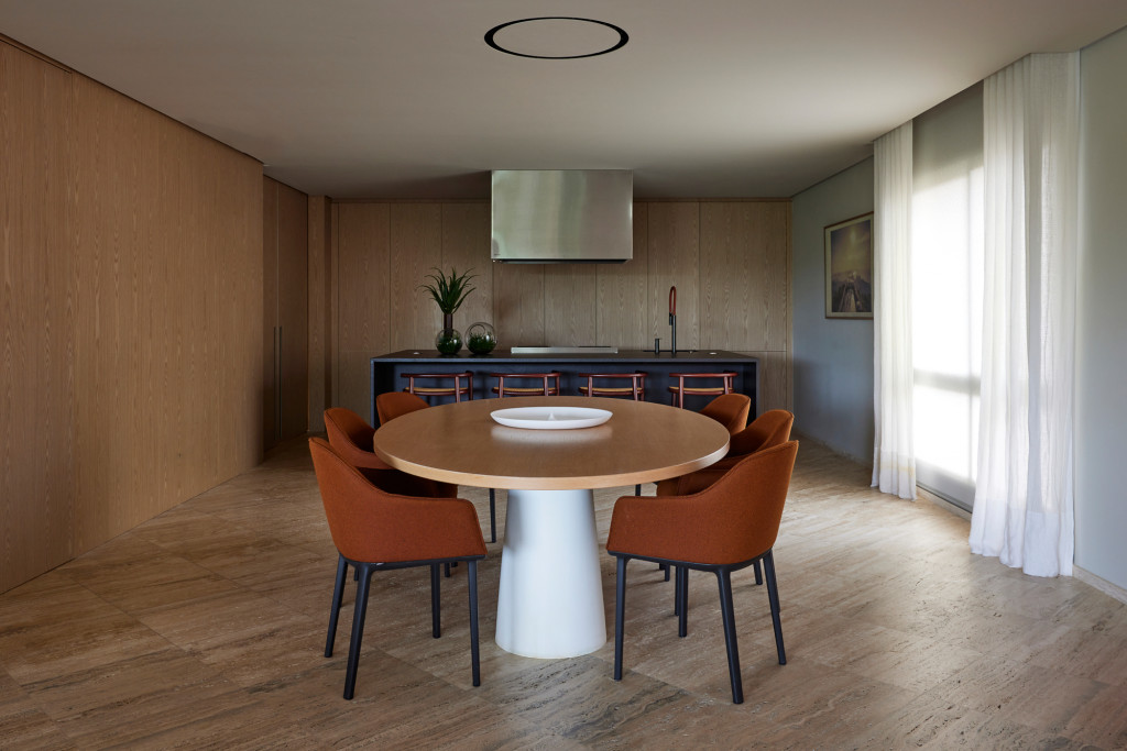 Designed to comfortably accommodate a couple and their young child in an apartment with a floor plan organized into two sectors, the P464 intelligently articulates a large modular carpentry bookcase and pieces of modern furniture. Crowning the composition, a glass cube supported by dark frames stands out in the social area houses a large climatized wine cellar and acts as a large showcase for a wine collection.