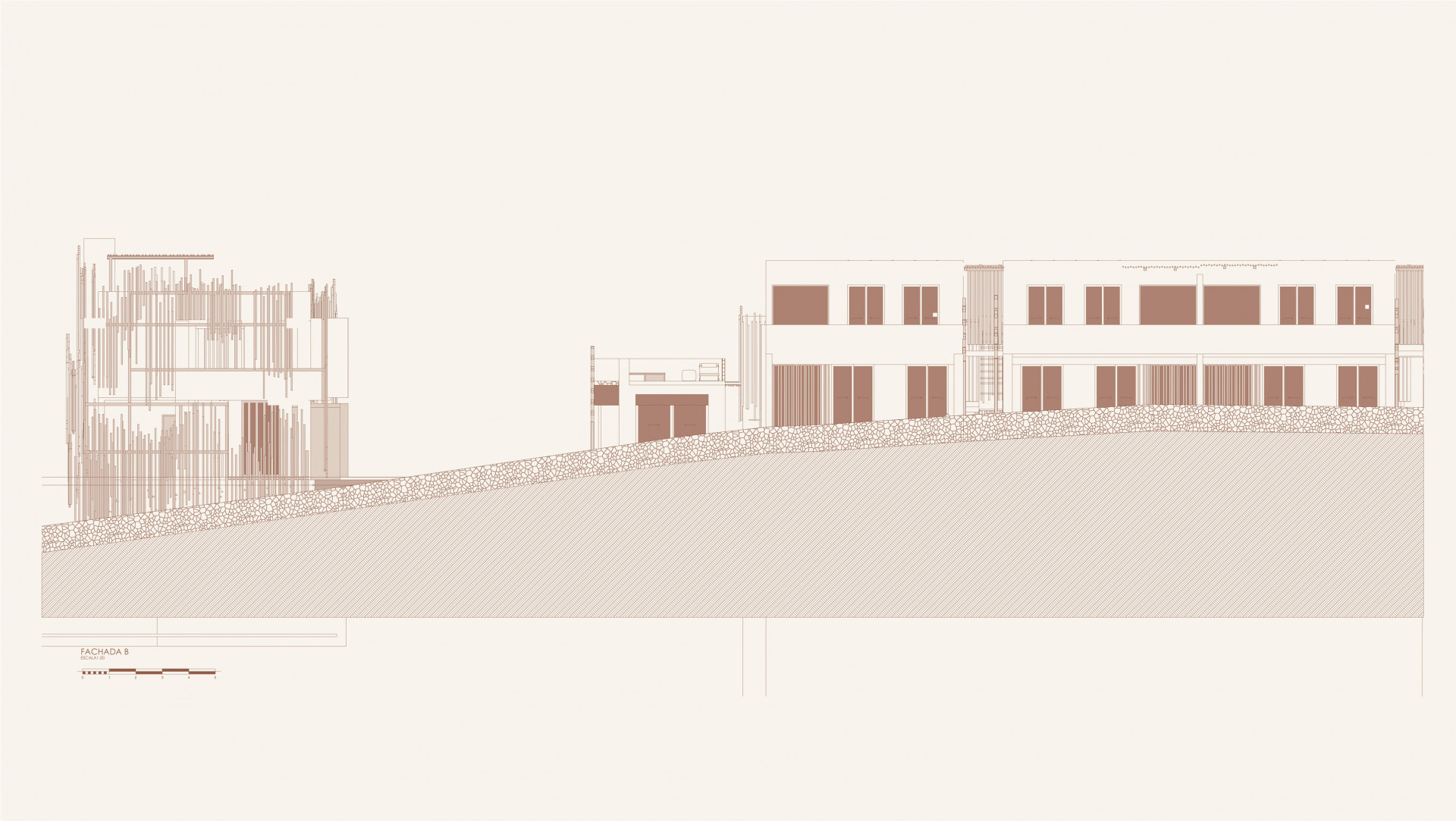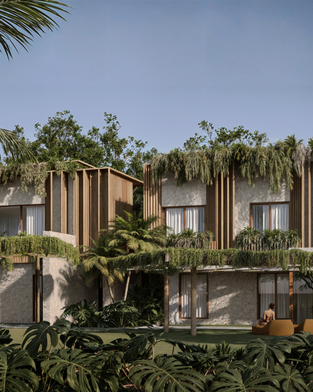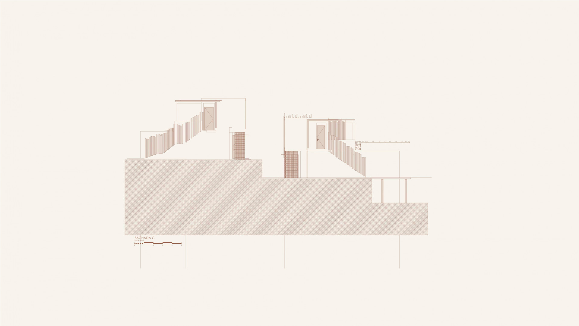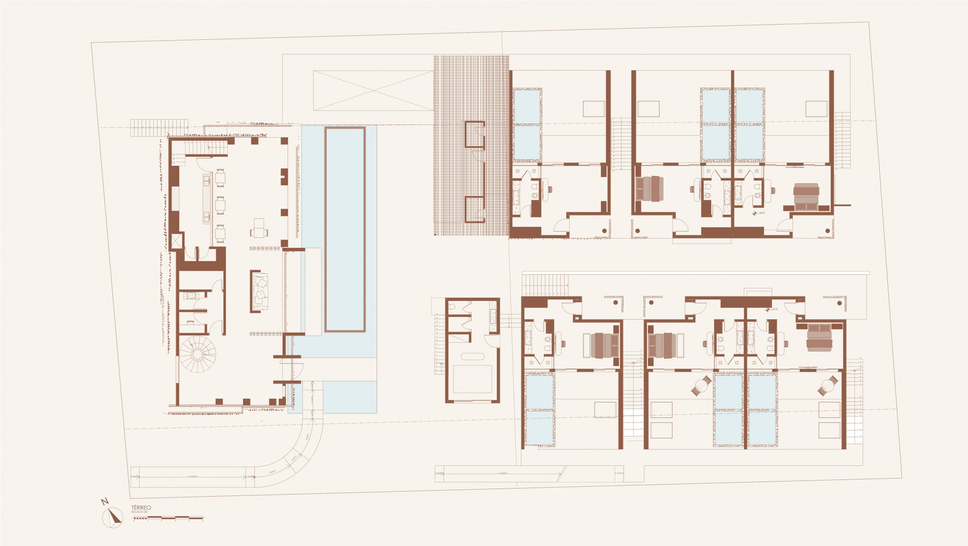 P478 is a boutique hotel composed of two programmatic blocks: the first is positioned transversely on the site, at the front of the lot, housing the lobby and restaurant, and oriented towards the interior of the lot, facing the pool that runs along its entire length. The second block houses the suites and consists of two parallel buildings with two floors, arranged longitudinally. On the ground floor, each apartment has its own private outdoor area, sheltered by the building’s volume, while on the upper floor, the units feature a private pool.