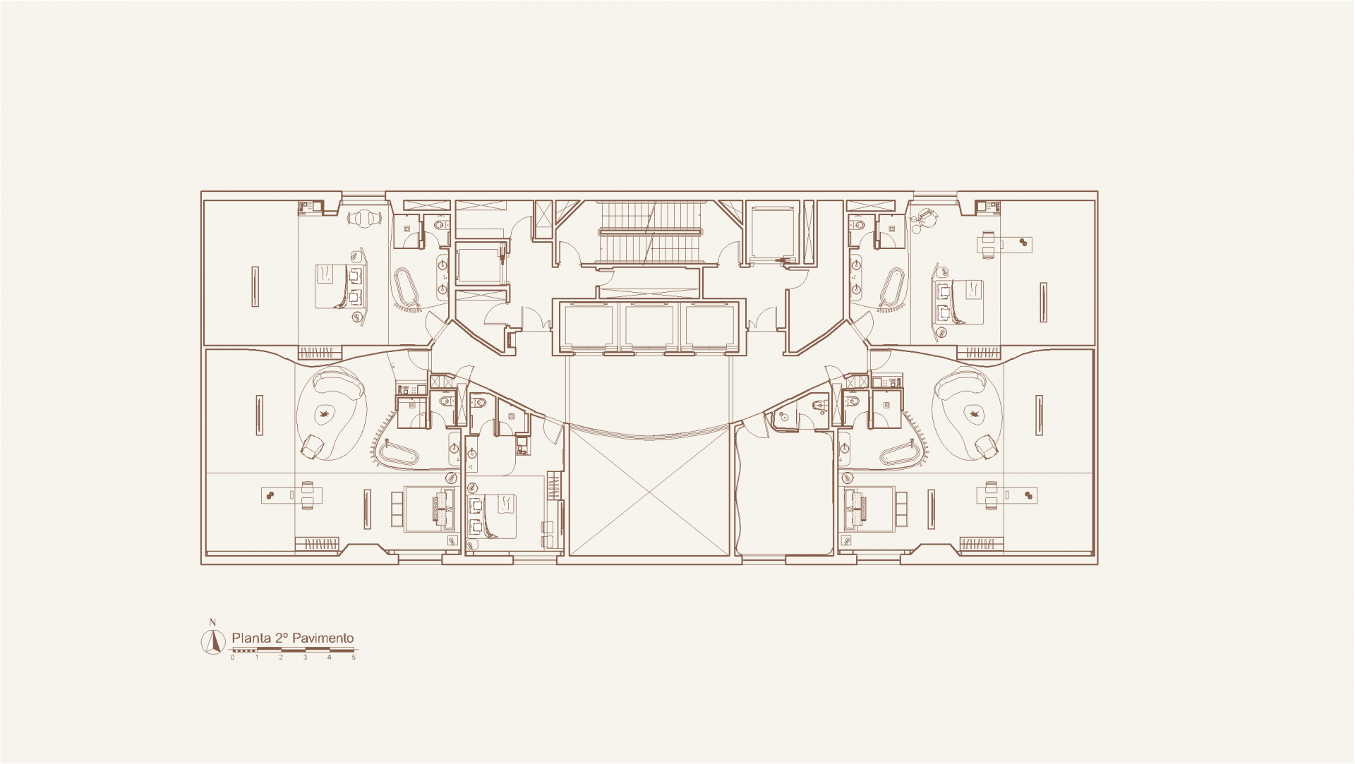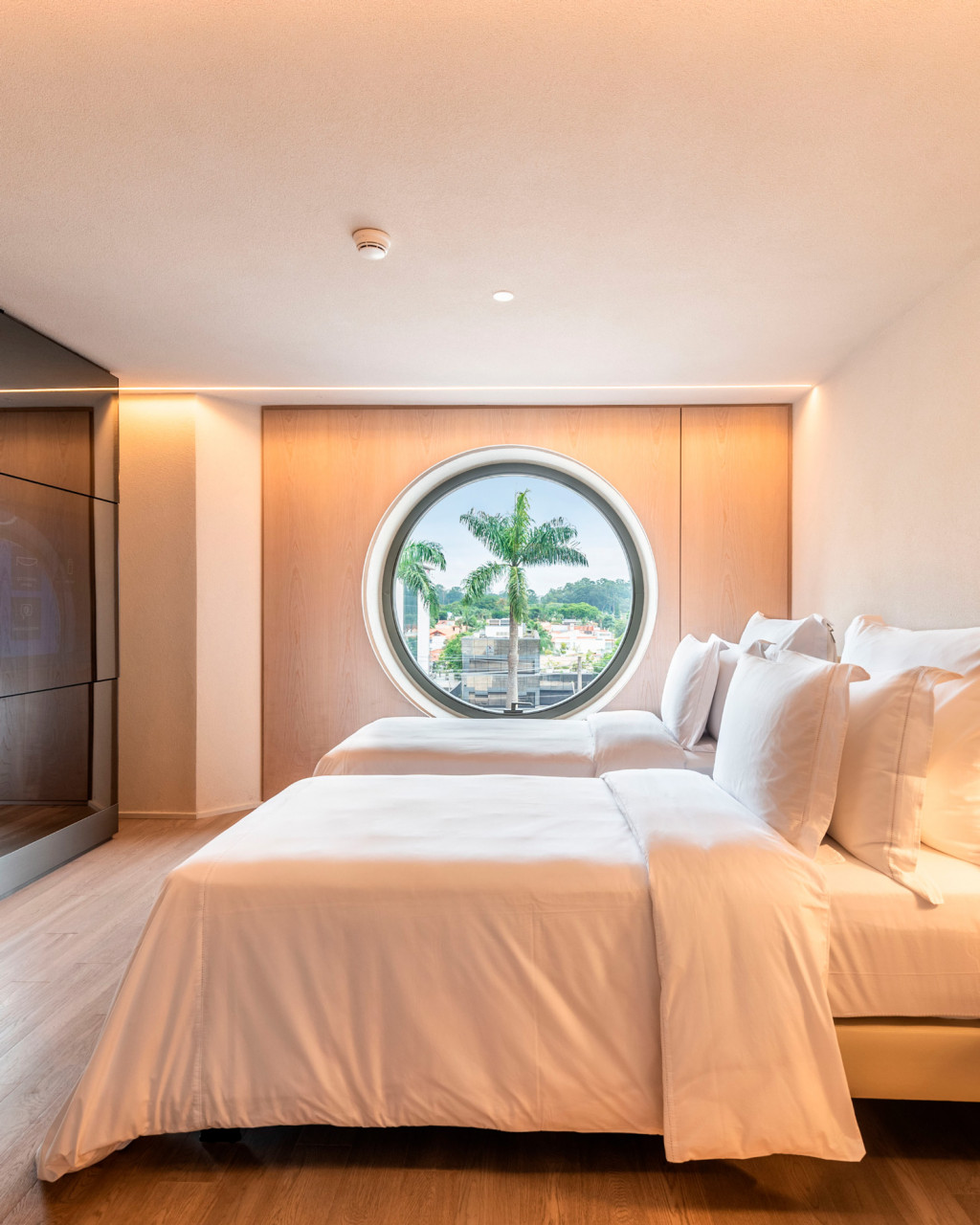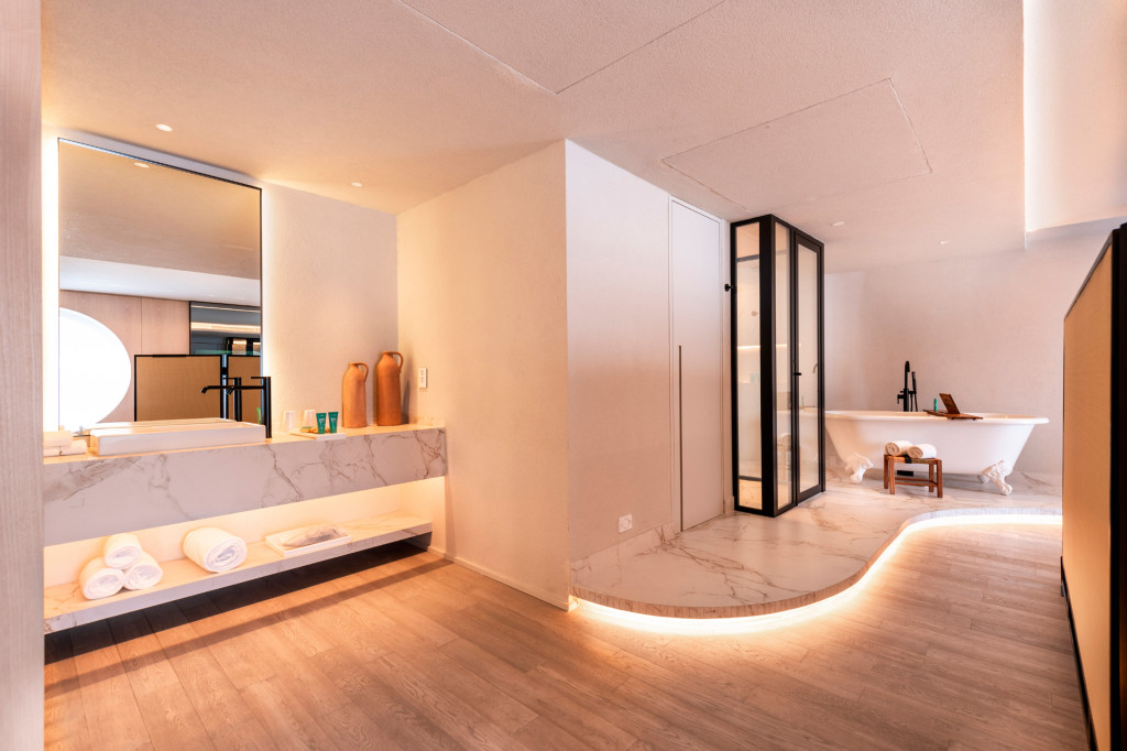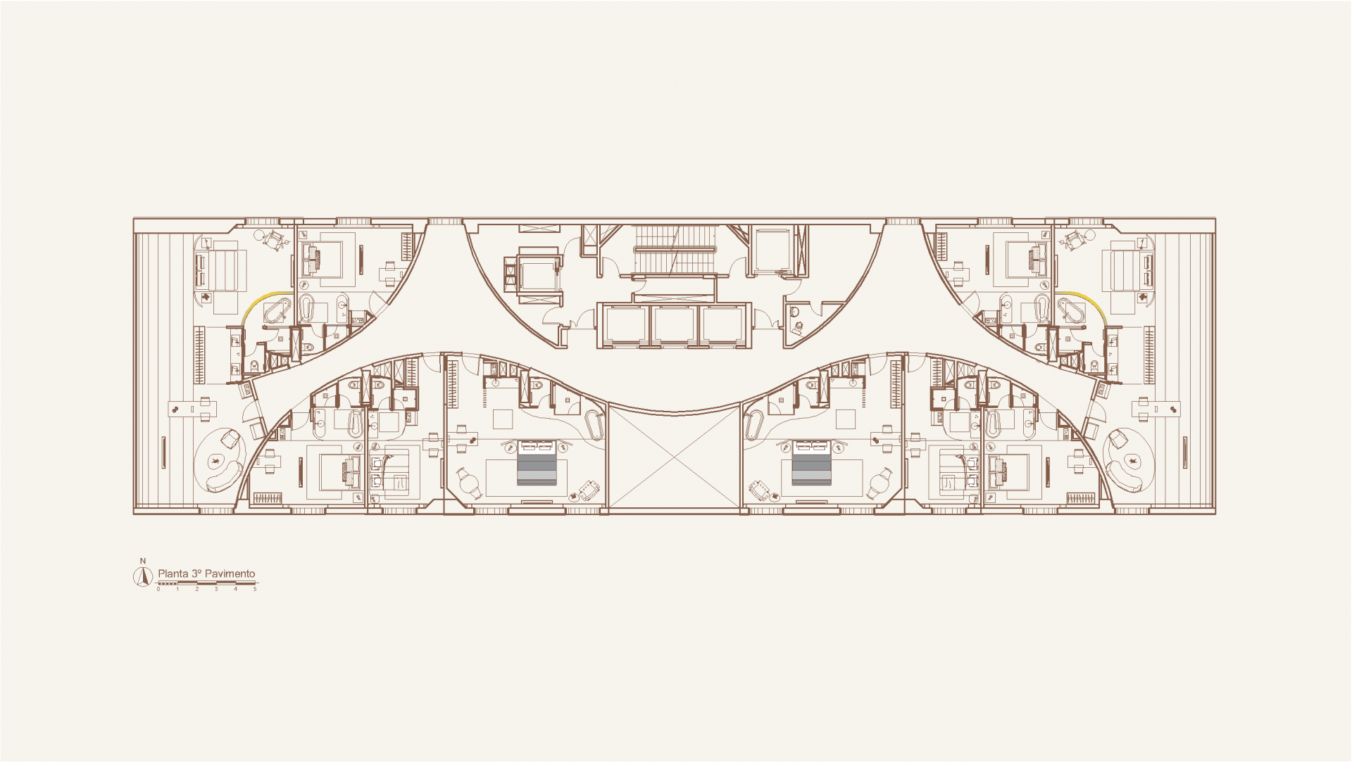 The concept for the retrofit project of Hotel Unique was inspired by Ruy Ohtake’s original architecture, aiming to modernize the suites while preserving their curved lines. The main changes include replacing orthogonal layouts with configurations that emphasize the building’s shape, such as combining two apartments with "porthole" windows for special views. The bathroom was reconfigured with an external sink and smart glass.  The atmosphere of the suites offers a sensory journey, beginning in the lobby and continuing through winding corridors to the bright and welcoming refuge of the suites.