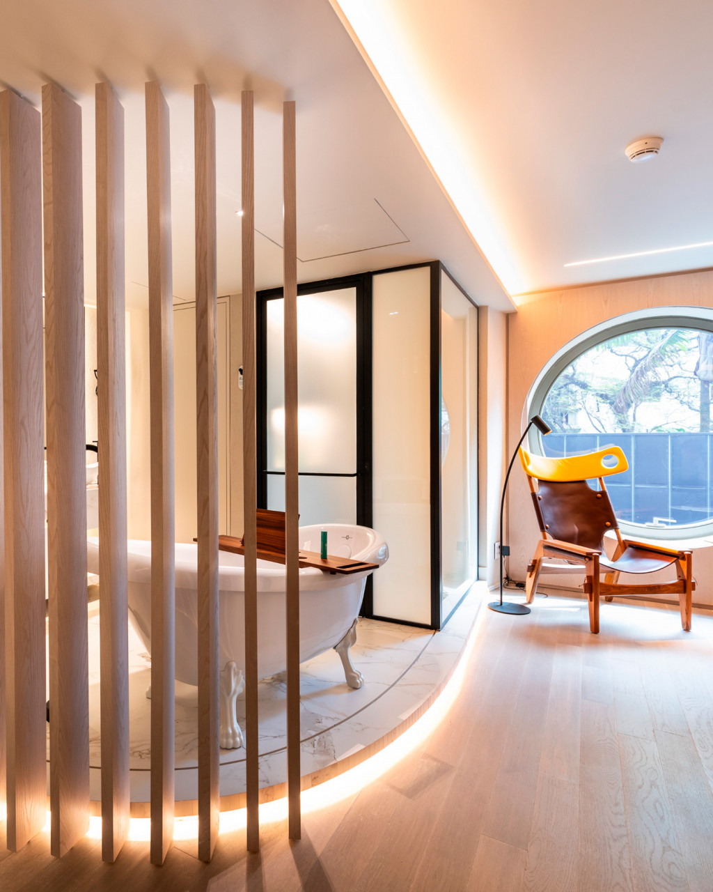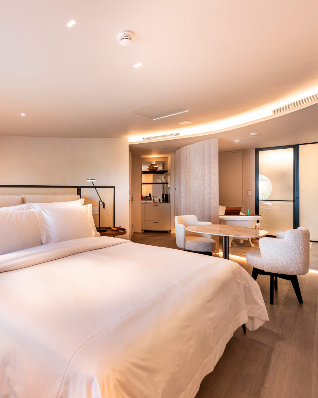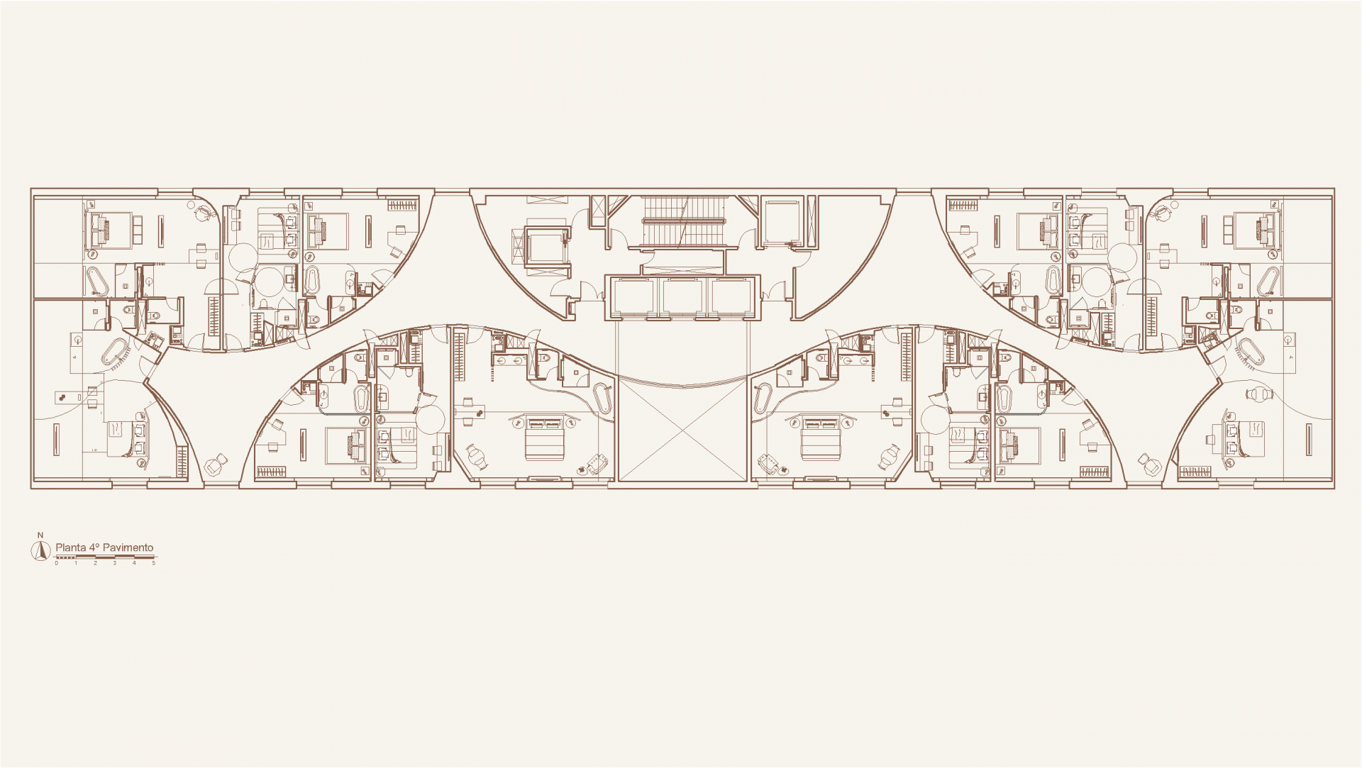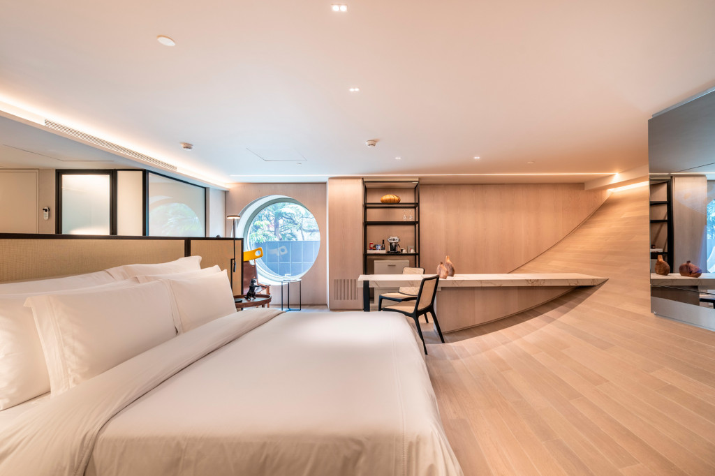 The concept for the retrofit project of Hotel Unique was inspired by Ruy Ohtake’s original architecture, aiming to modernize the suites while preserving their curved lines. The main changes include replacing orthogonal layouts with configurations that emphasize the building’s shape, such as combining two apartments with "porthole" windows for special views. The bathroom was reconfigured with an external sink and smart glass.  The atmosphere of the suites offers a sensory journey, beginning in the lobby and continuing through winding corridors to the bright and welcoming refuge of the suites.