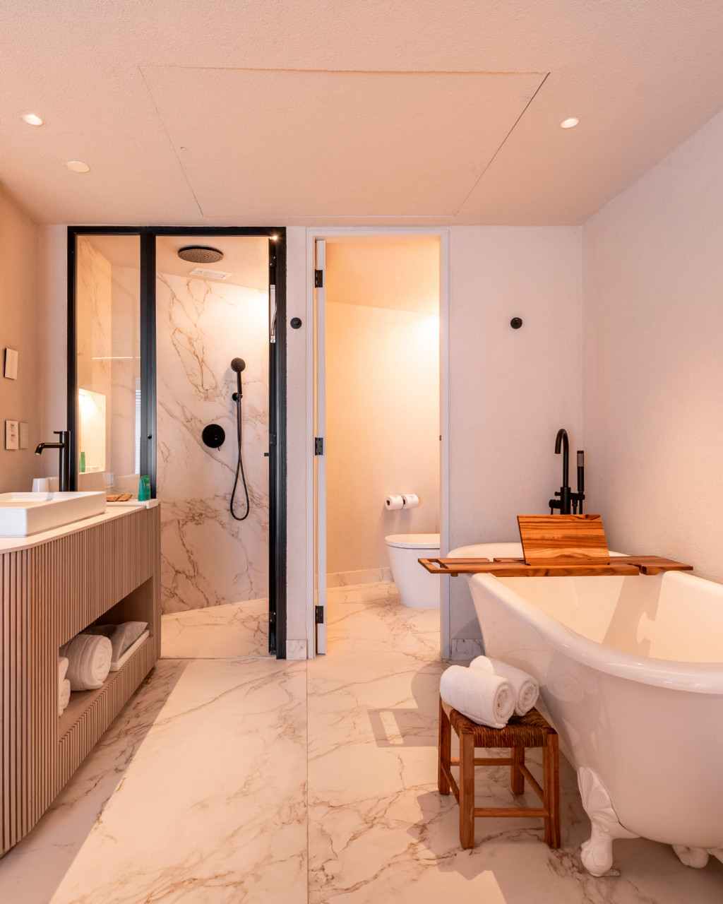 The color palette features dark tones in the corridors and warm tones in the suites, while the furniture includes icons of Brazilian modern design and indigenous handcrafted elements. Project highlights include collaboration with Ornare for the cabinetry and Roca for matte black fixtures and the Horizon sink, which complement the sophistication of the space. Every detail was meticulously designed to provide a unique experience, seamlessly integrated with the hotel's legacy.