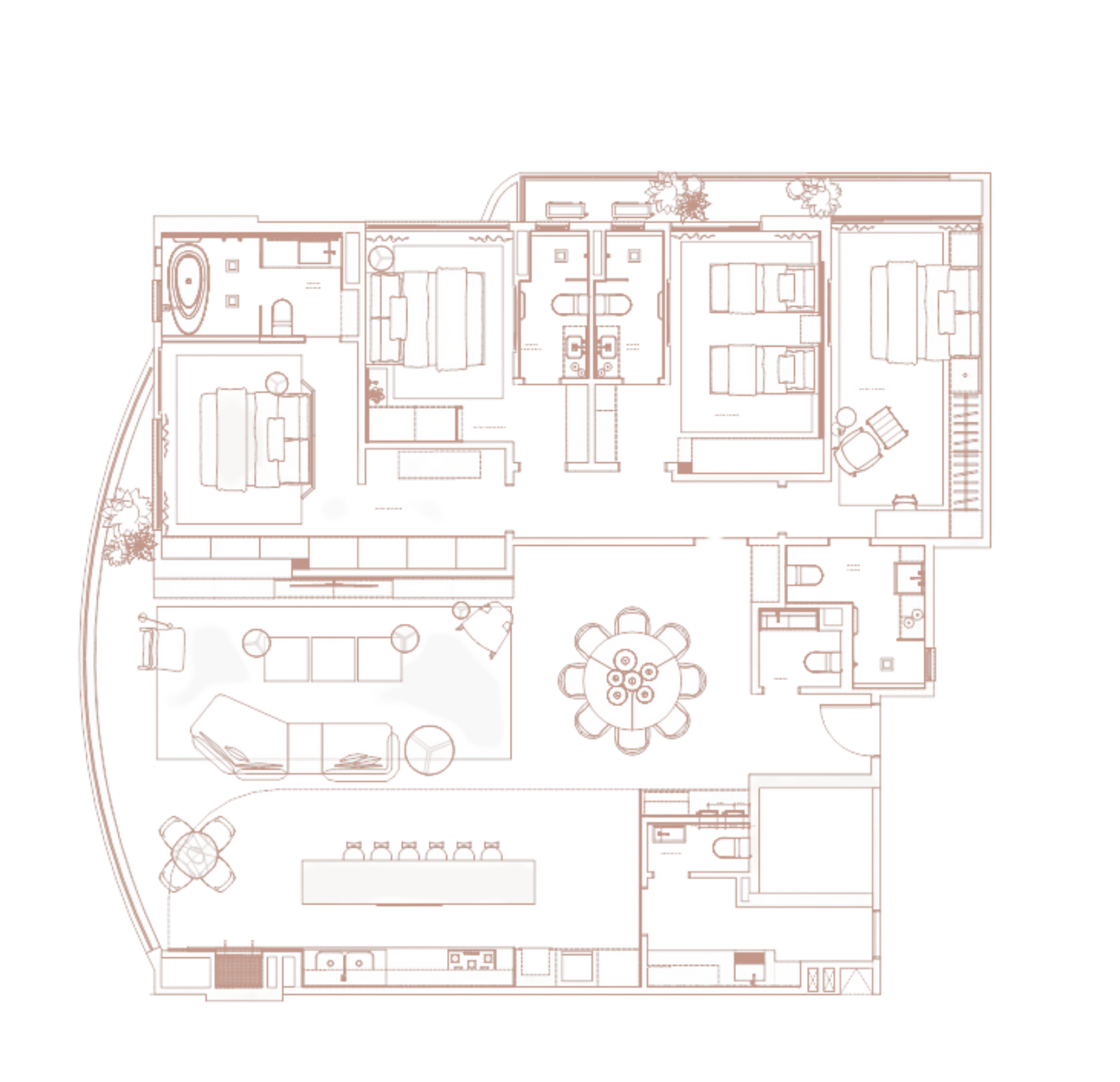 The layout prioritizes the internal flow and the view, with generous and interconnected social areas—living room, dining room, and balcony—designed to offer comfort and elegance. Natural materials such as wood, textured stone, and matte finishes reinforce the project's sensory identity, while well-crafted spatial solutions, like the master suite with a bed facing the window, add personality and uniqueness to the overall composition.