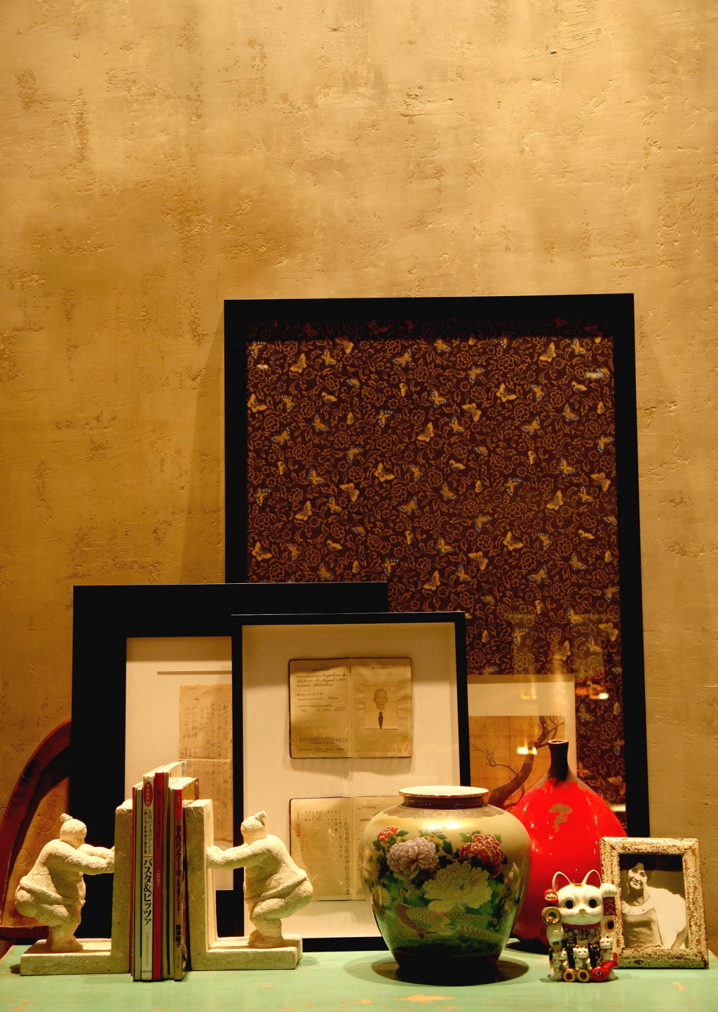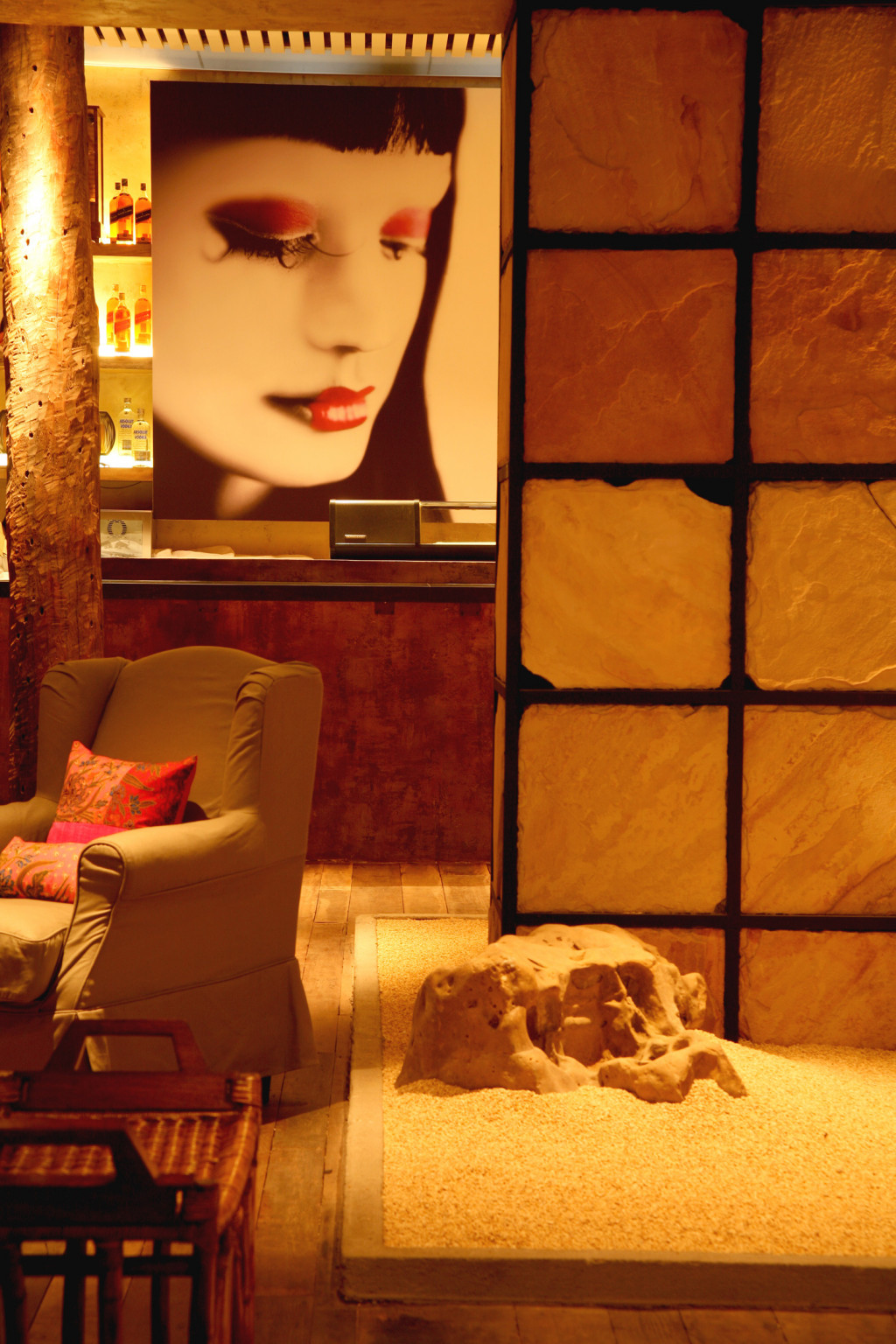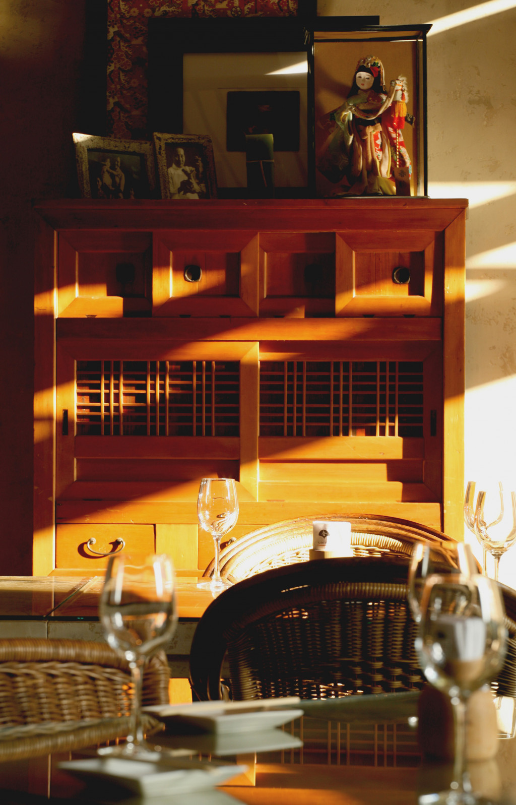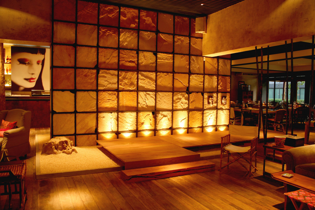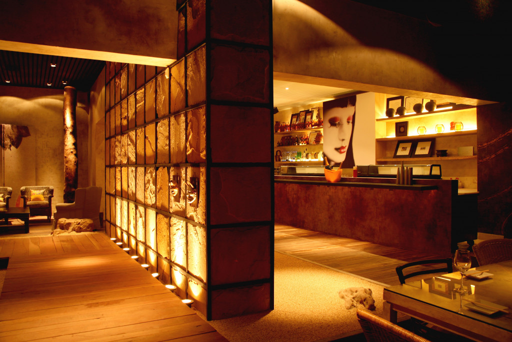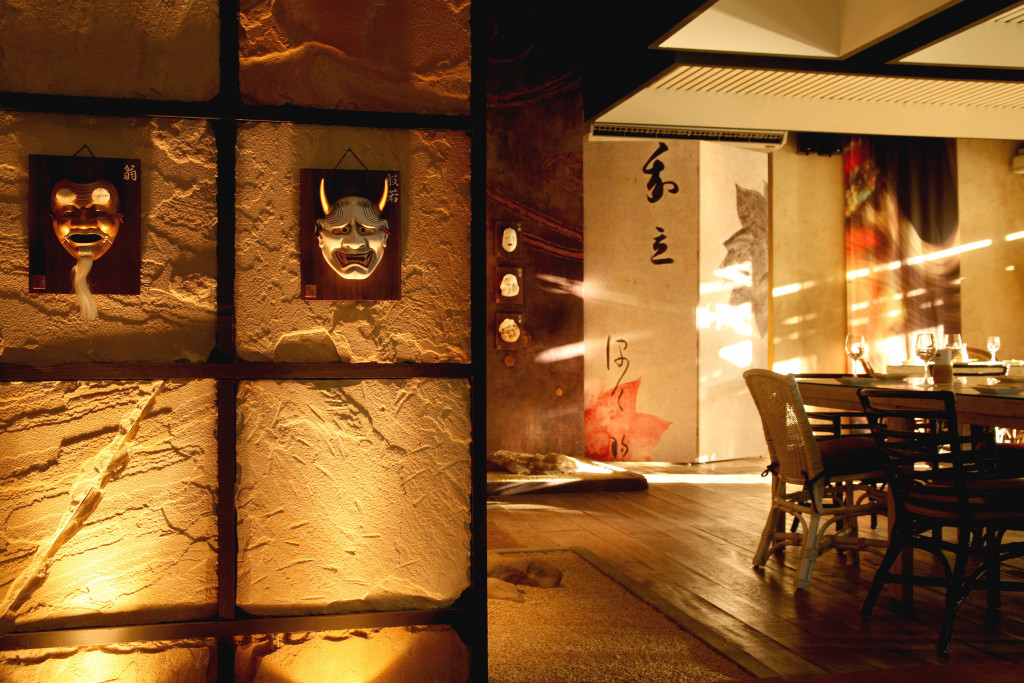 In this interior design project, the goal was to create an atmosphere that references Japan’s ancient culture. In a spacious building, the lounge, bar, and main seating area with tables and armchairs share the restaurant's space. The reclaimed wood flooring, wood-slat ceiling, and walls painted with Venetian stucco technique bring warmth and a sense of “history” to the location. Additionally, hand-painted tables, each with a motif that reflects Japanese culture, and the choice of Japanese masks as decoration at the entrance—used to ward off evil spirits and welcome prosperity—add to the ambiance. In the lounge, a custom wooden screen was designed, and each armchair features a unique color, model, and fabric pattern.