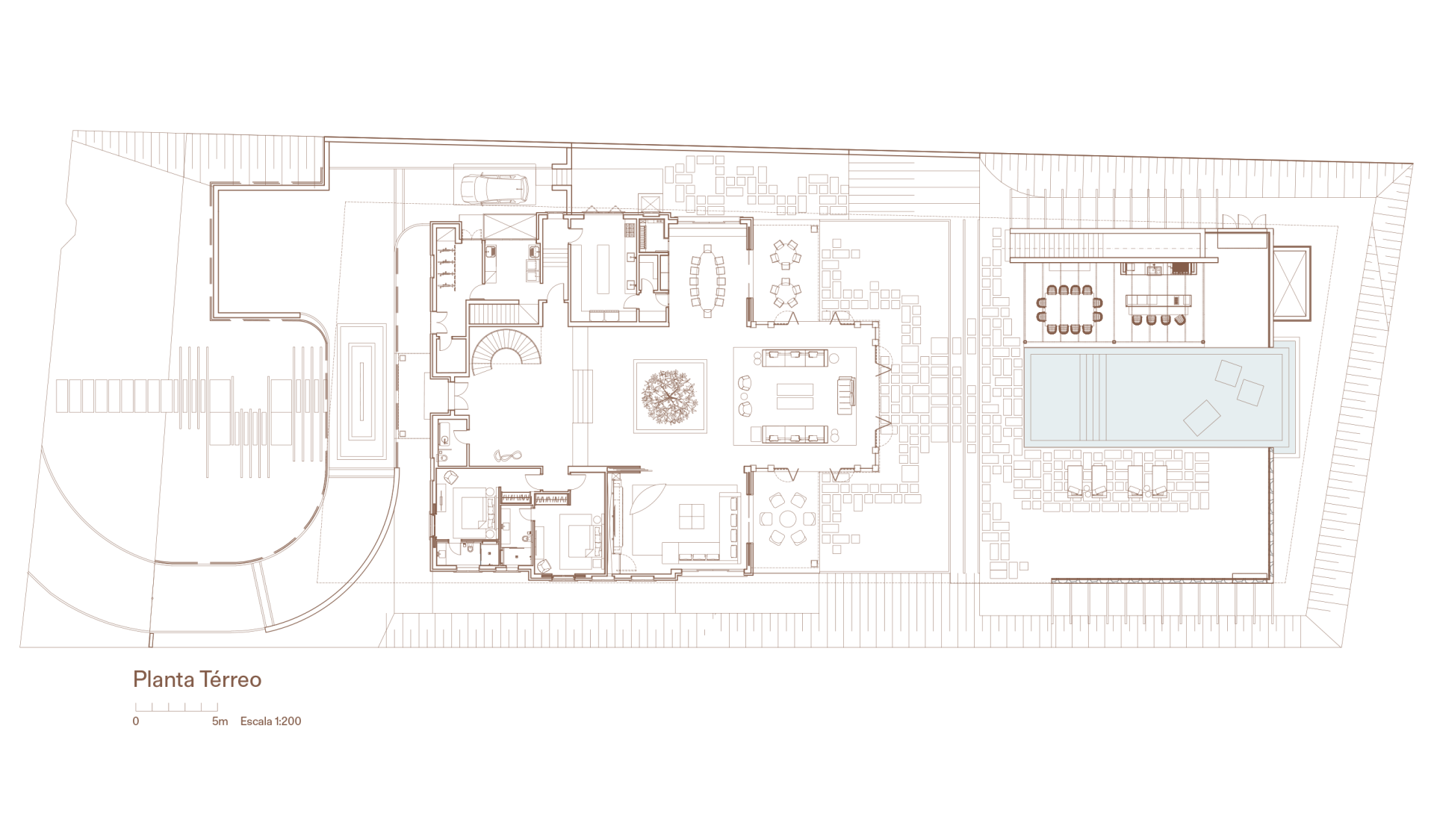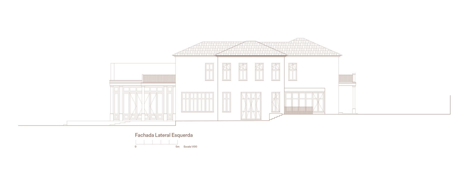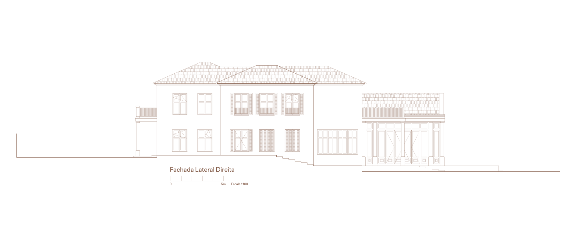 No interior, ela se transforma: o peso da construção em alvenaria se converte em leveza e transparência com uma estrutura metálica que se projeta em direção ao quintal, acomodando grandes janelas e criando um pavilhão de cristal no centro da casa.