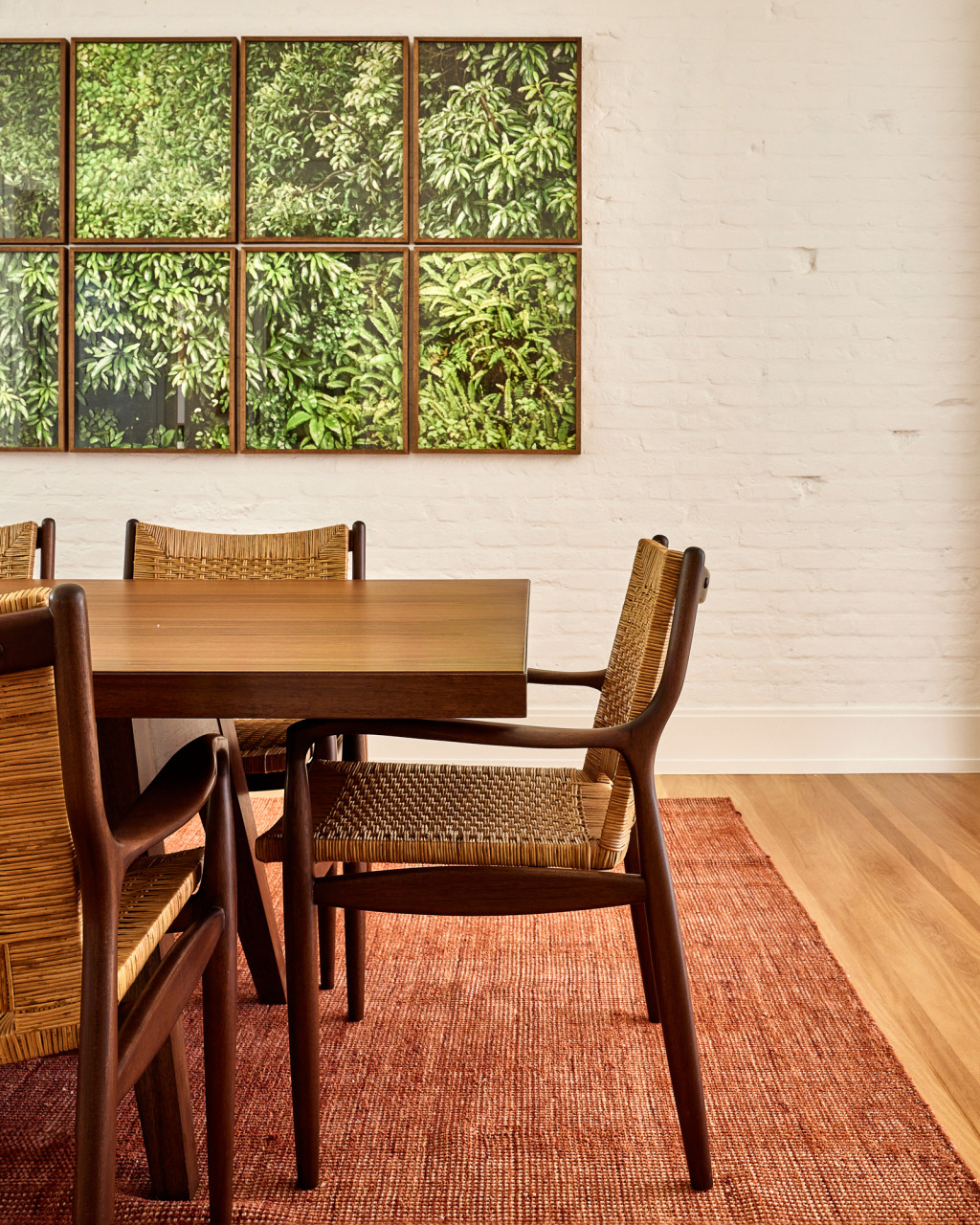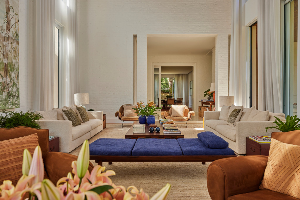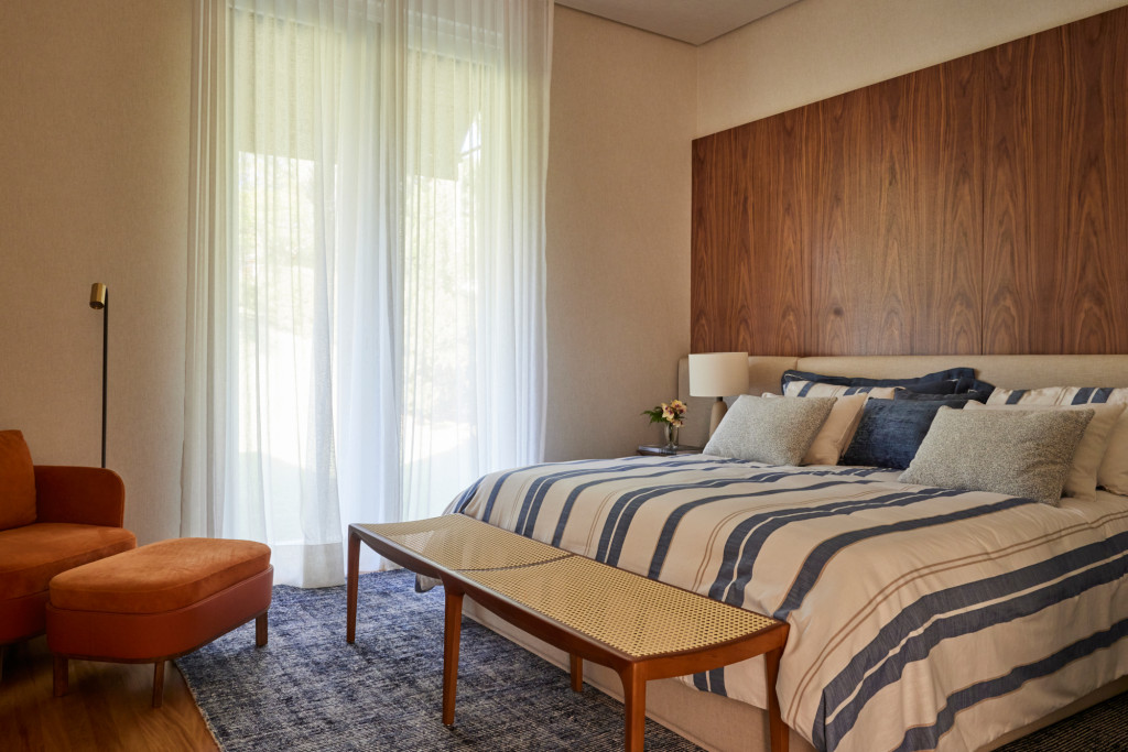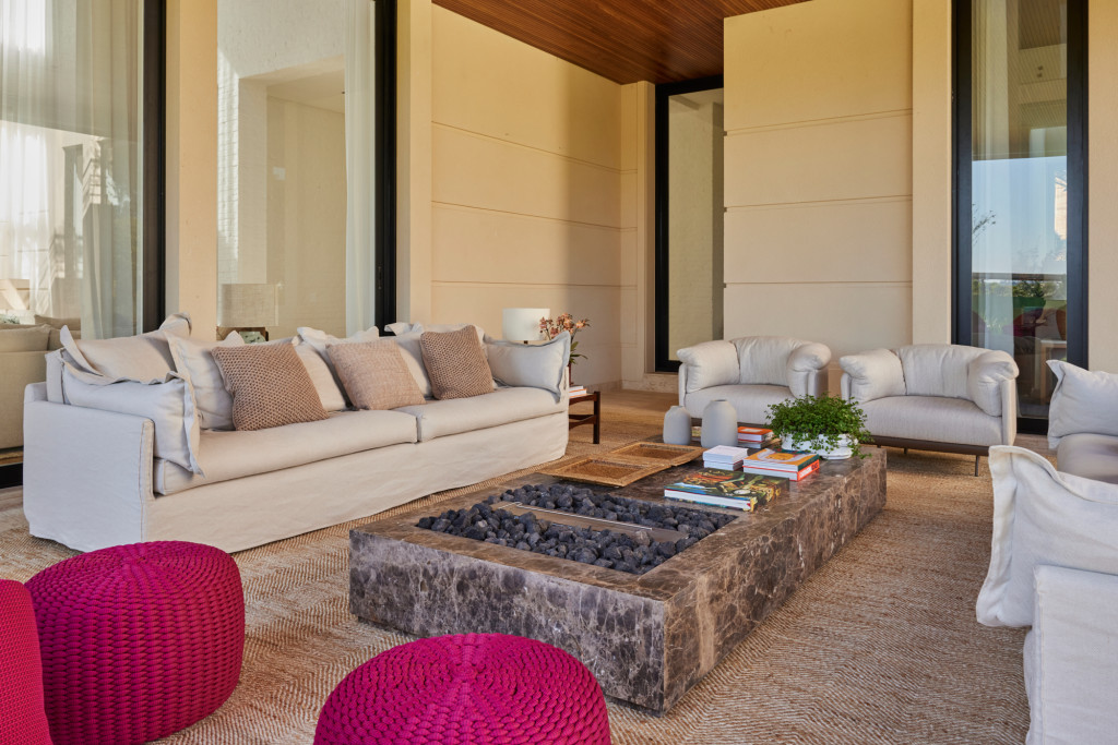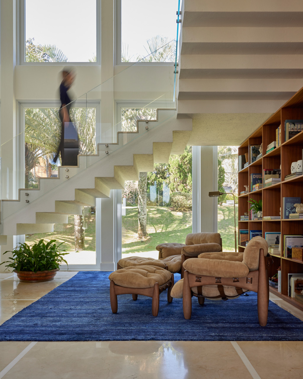O projeto de interiores assume papel central. Materiais e mobiliário foram escolhidos com precisão para destacar a experiência do habitar. Tons terrosos, madeira e poucos elementos de cor intensa, como as poltronas Nido de Paola Lenti, revelam um arranjo meticuloso, pensado para que o calor da vida no espaço sobreponha a frieza do desenho.
