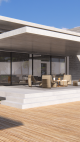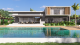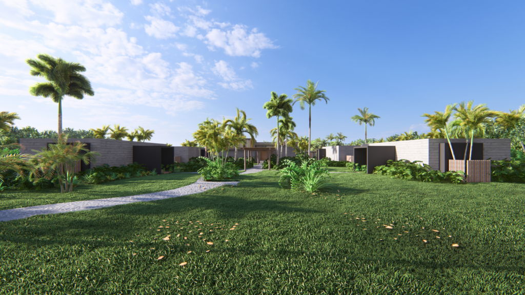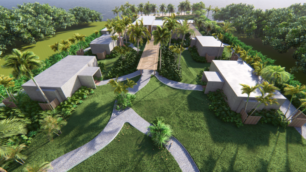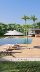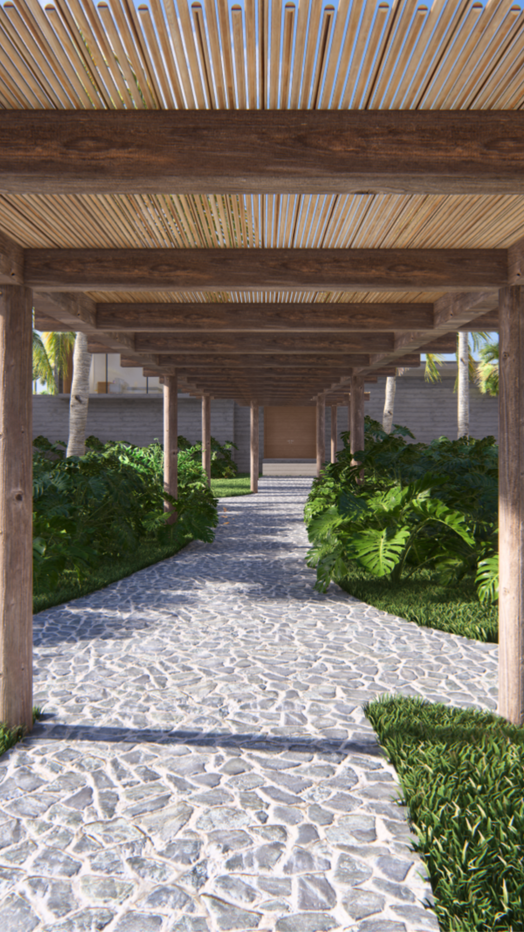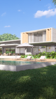 Entre a água e o verde, volumes horizontais se implantam num terreno marcado por percursos sinuosos e pérgolas em madeira, que conduzem o caminhar contemplativo.