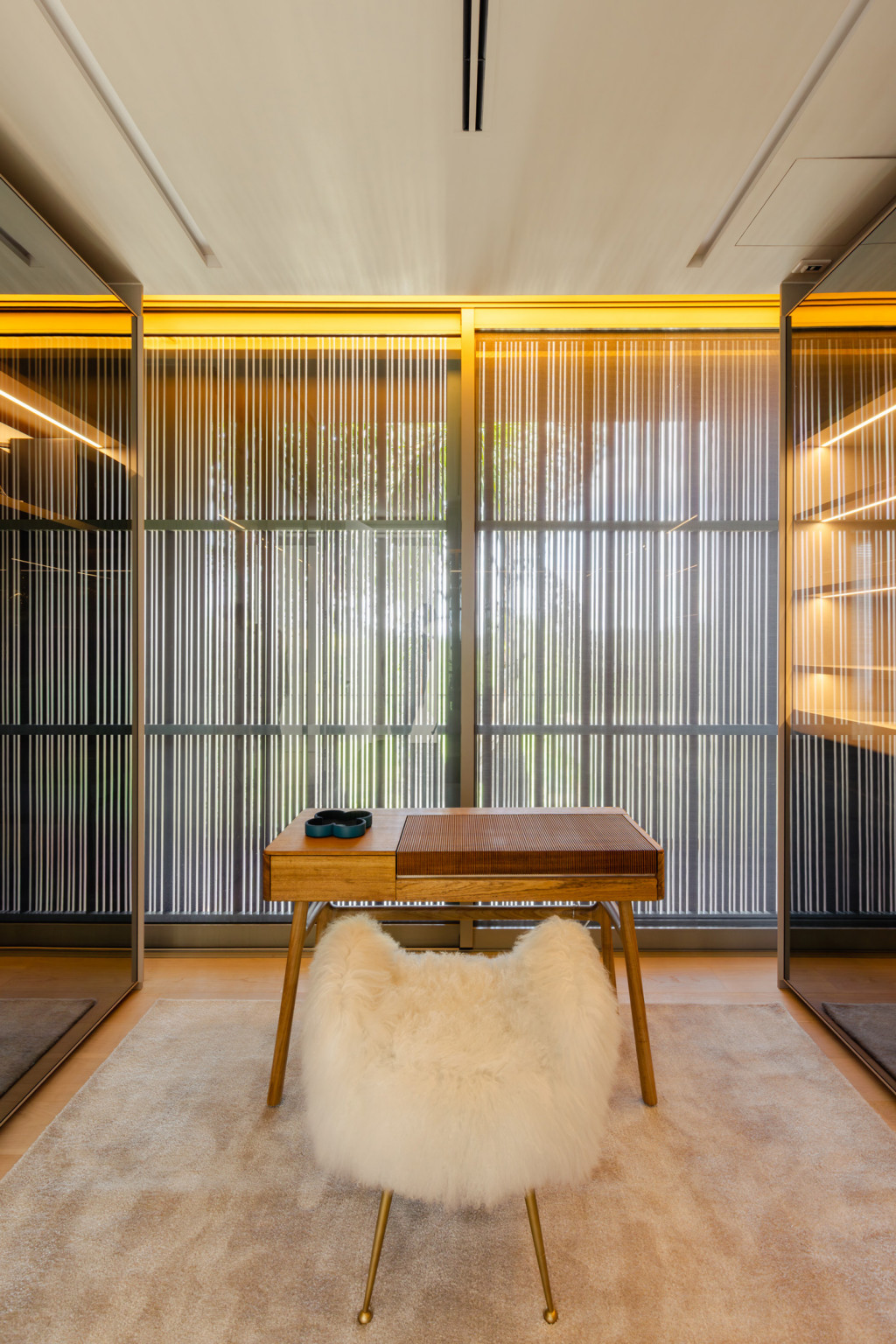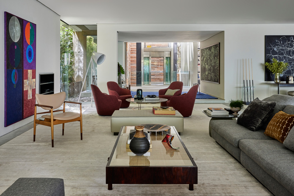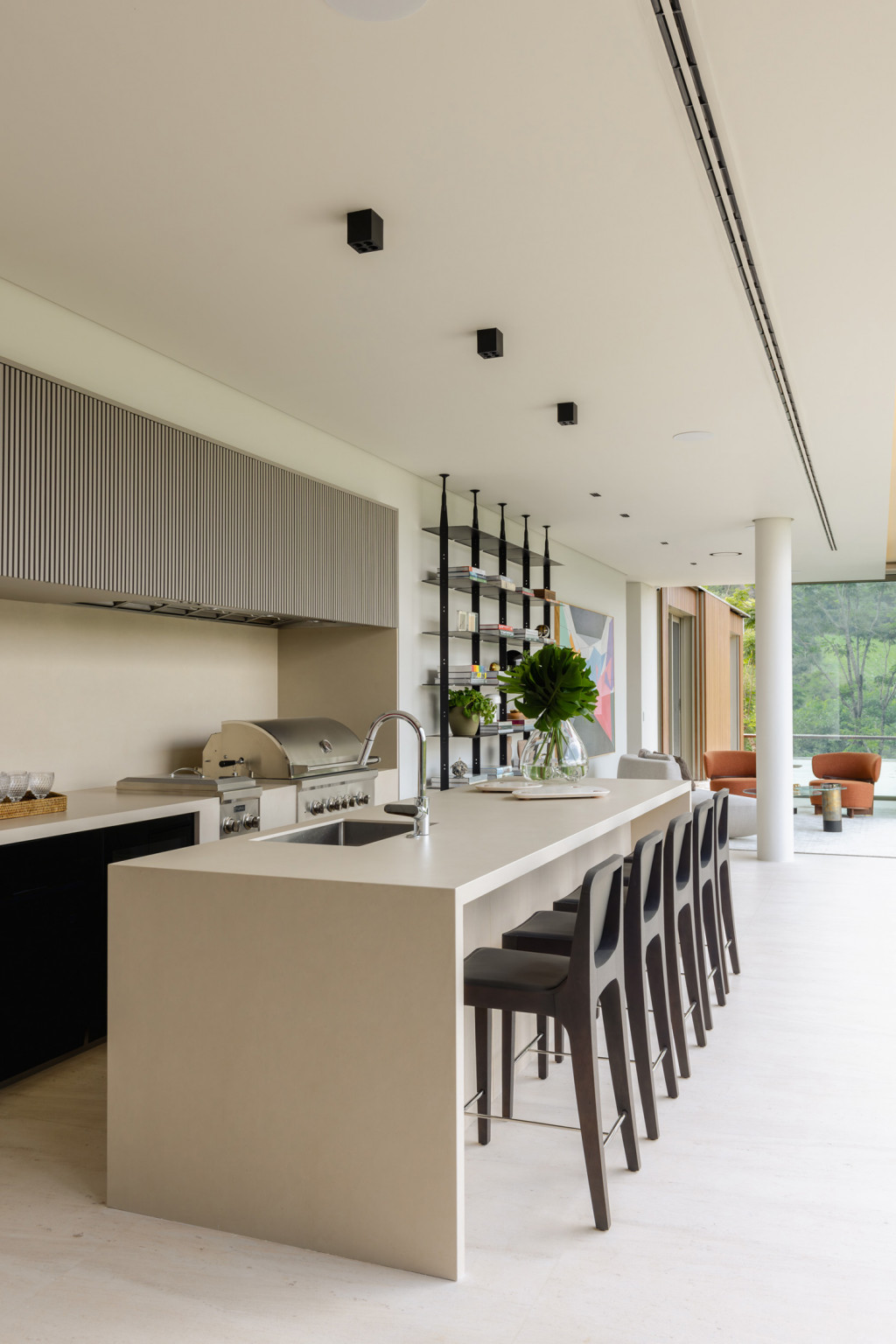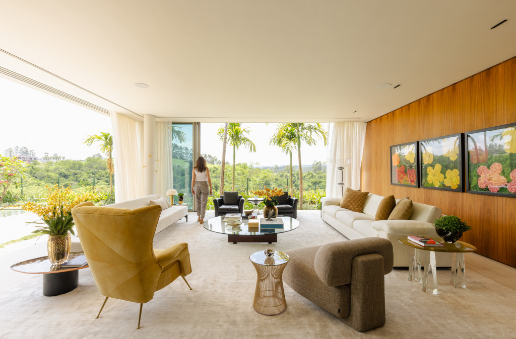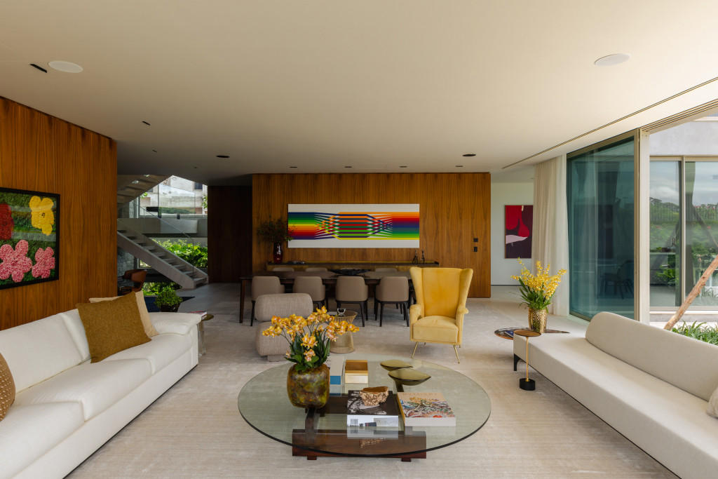 Sofás em tons de bege, banquetas grafite, uma mesa de jantar em pedra branca e uma estante metálica criam uma base harmônica, enquanto poltronas alaranjadas e amarelas conferem vitalidade aos ambientes. Com transparências, texturas e um diálogo contínuo entre arte e natureza, o P559 celebra a integração arquitetônica com a paisagem, tornando ambos os elementos os protagonistas do projeto.