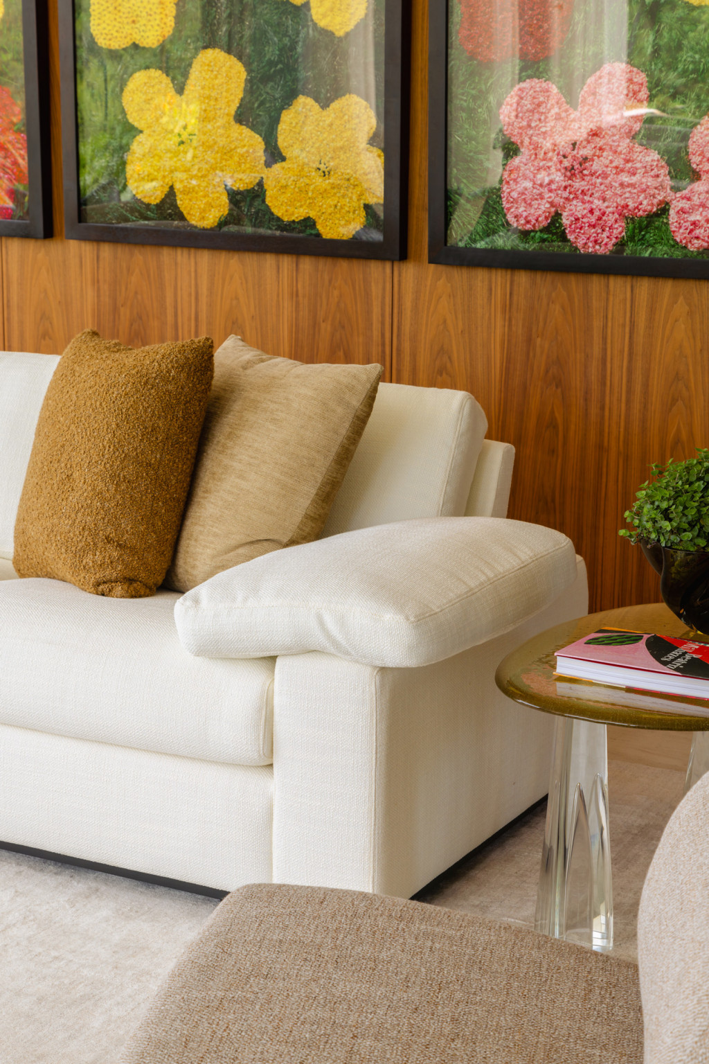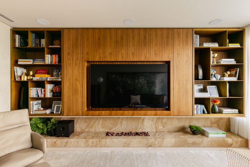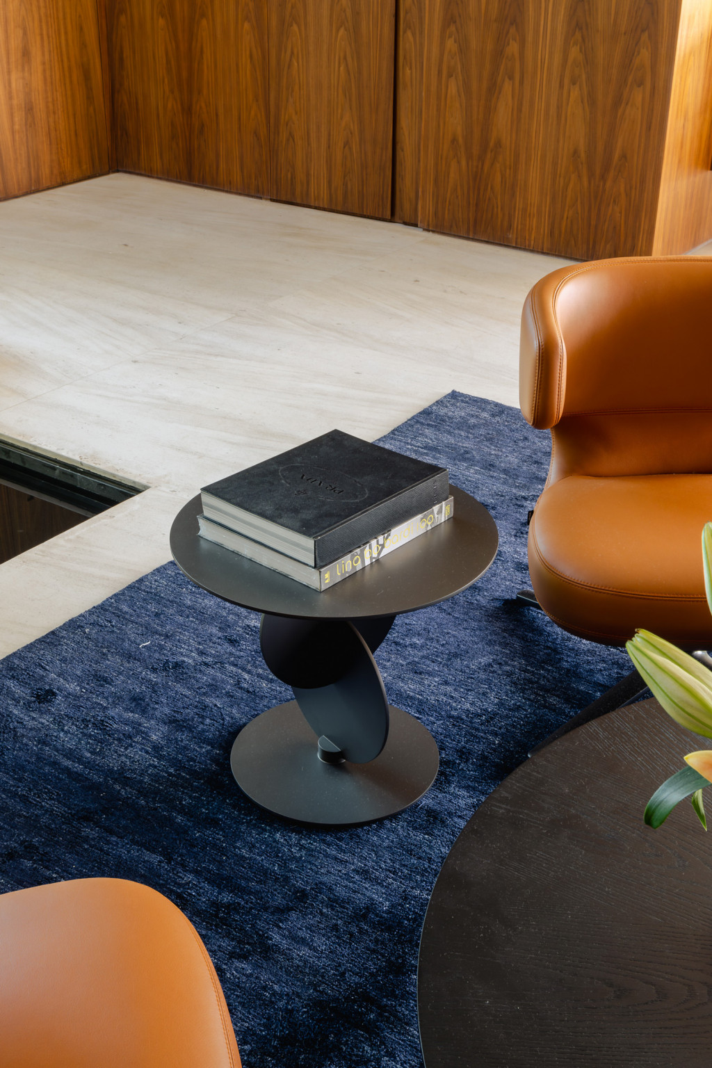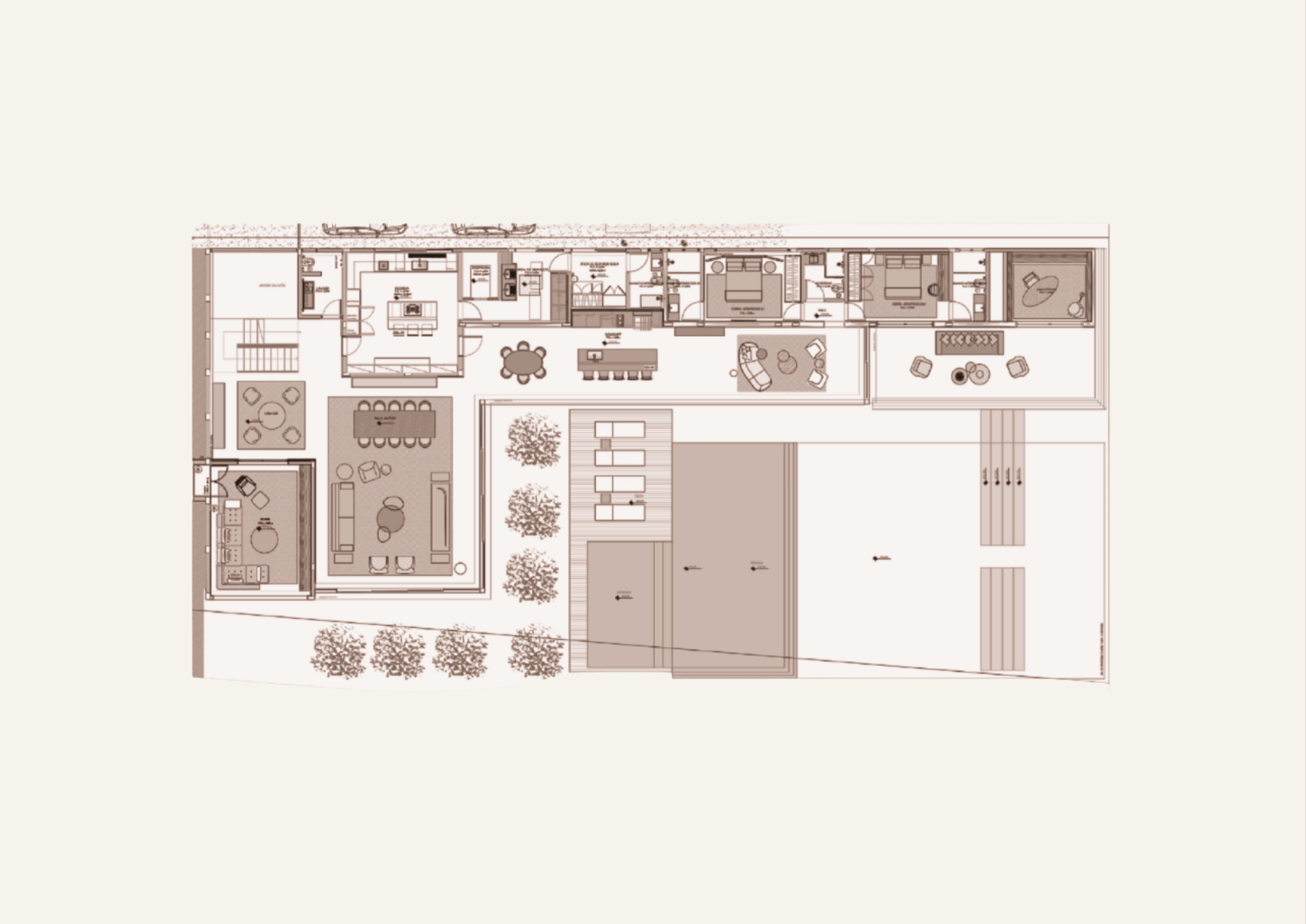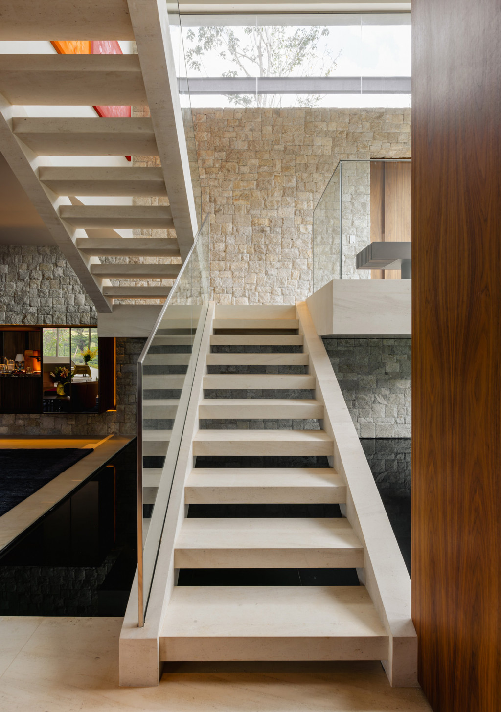 Sofás em tons de bege, banquetas grafite, uma mesa de jantar em pedra branca e uma estante metálica criam uma base harmônica, enquanto poltronas alaranjadas e amarelas conferem vitalidade aos ambientes. Com transparências, texturas e um diálogo contínuo entre arte e natureza, o P559 celebra a integração arquitetônica com a paisagem, tornando ambos os elementos os protagonistas do projeto.
